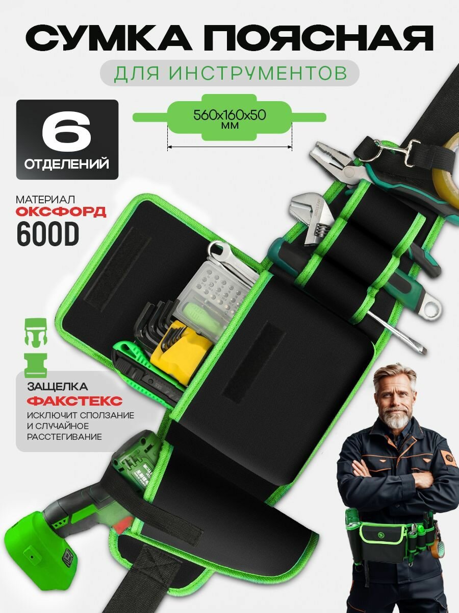 Сумка поясная для инструментов 560x160x50 мм, поясная сумка строительная 6 отделений информация: