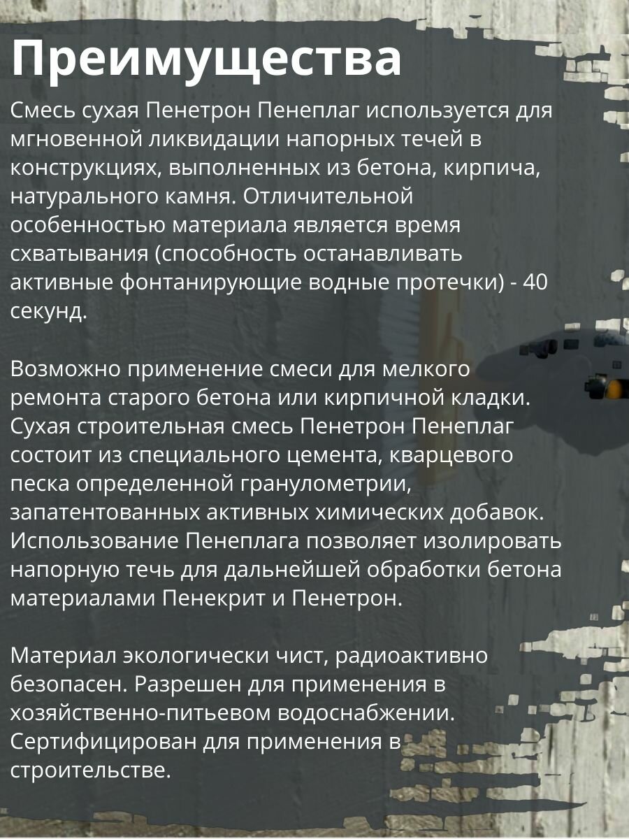 Пенетрон Пенеплаг Сухая смесь для мгновенной ликвидации напорных течей, 4 кг информация: