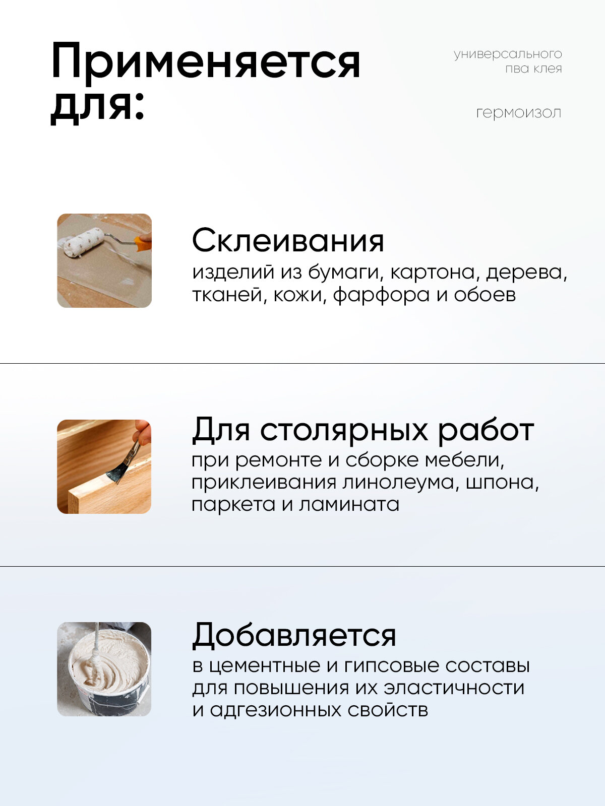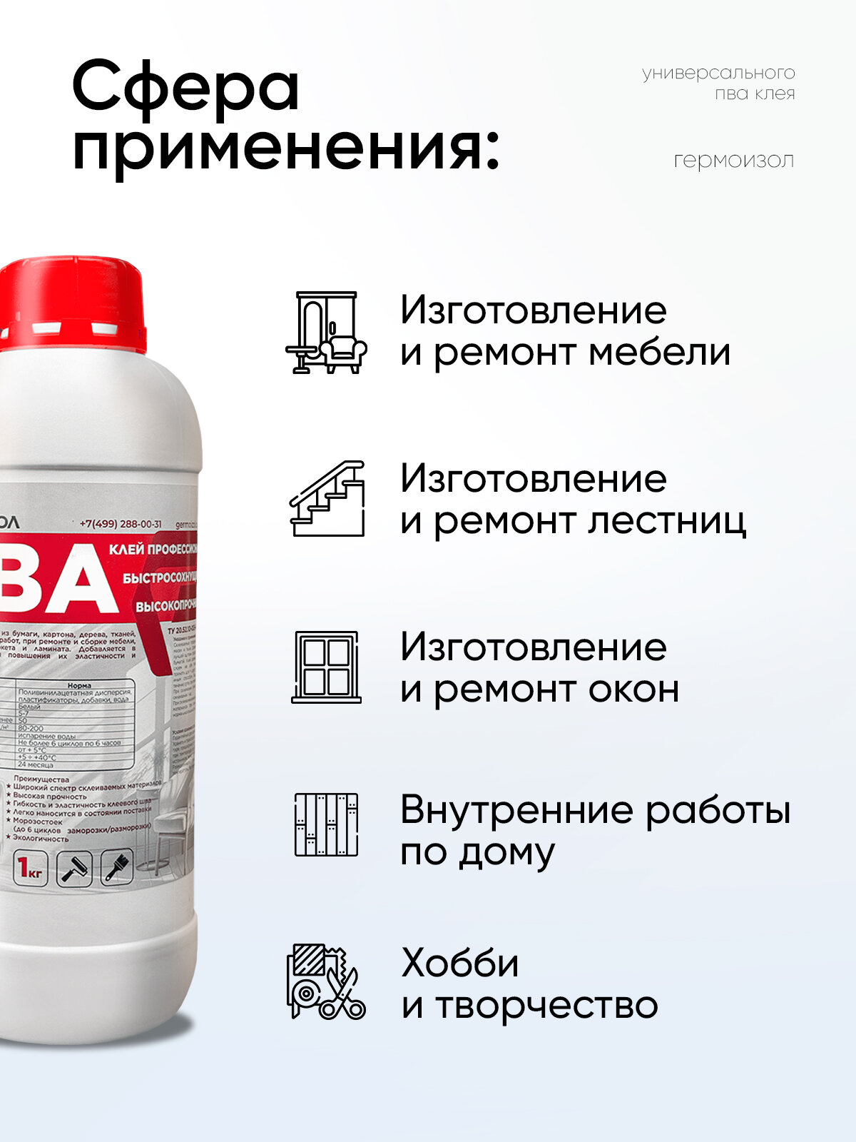 Клей Гермоизол ПВА быстросохнущий высокопрочный 1кг для внутренних работ информация: