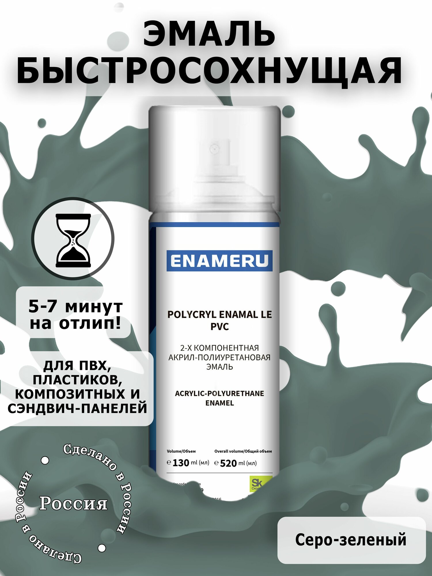 Отзывы на Аэрозольная краска Серо зеленый Энацвет для пластика быстросохнущая, Акрил-полиуретановая, Полуматовая, 0.52 л