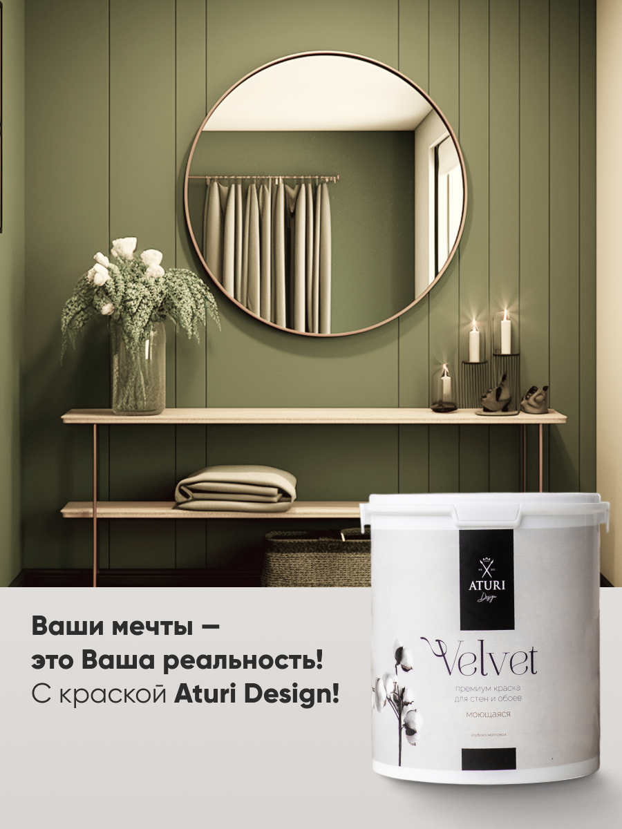 Отзывы на Краска Aturi Design Velvet интерьерная, для стен, моющаяся, цветная; Цвет: Тропический хаки, 1,4 кг