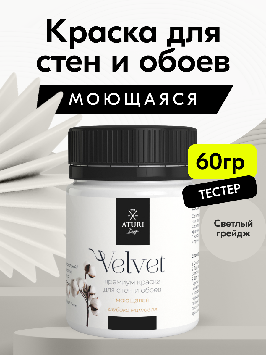 Краска для стен моющаяся Aturi Design Velvet тестер 60 гр, Цвет: Светлый грейдж, интерьерная, матовая информация: