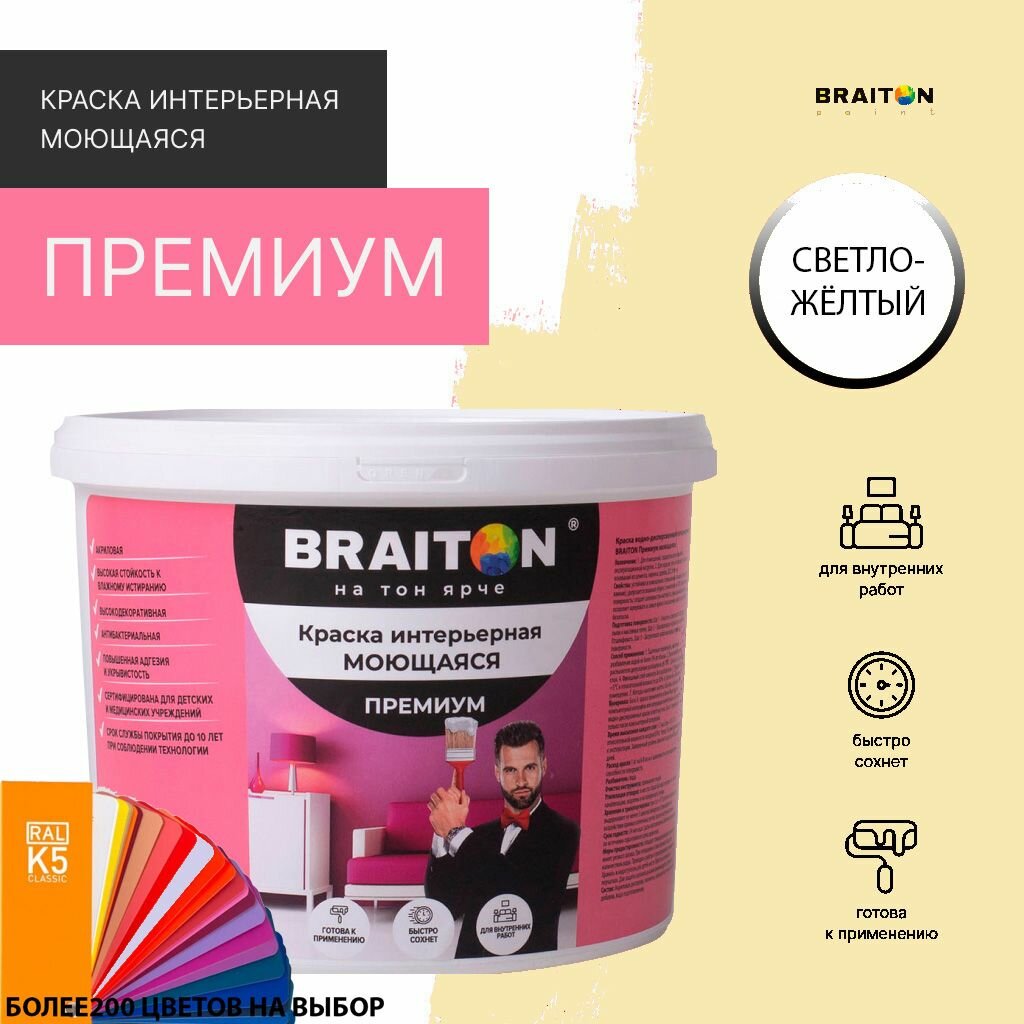Краска ВД интерьерная BRAITON Премиум Моющаяся 2,5 кг. Цвет Лимонно-желтый RAL 1012 2 954 ₽