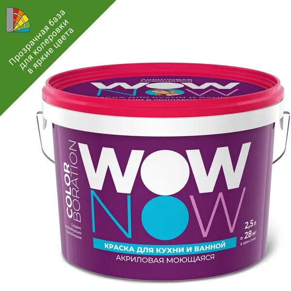 Краска для стен кухни и ванны Wow Now моющаяся полуматовая прозрачная база С 2.5 л информация:
