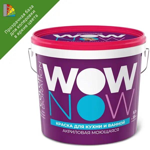 Краска для стен кухни и ванны Wow Now моющаяся полуматовая прозрачная база С 5 л информация:
