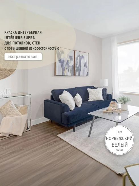 INTERIEUR SUPRA водоэмульсионная экстраматовая краска для стен и потолков, моющаяся, 0.9 л цвет Холодный белый OW 107 информация: