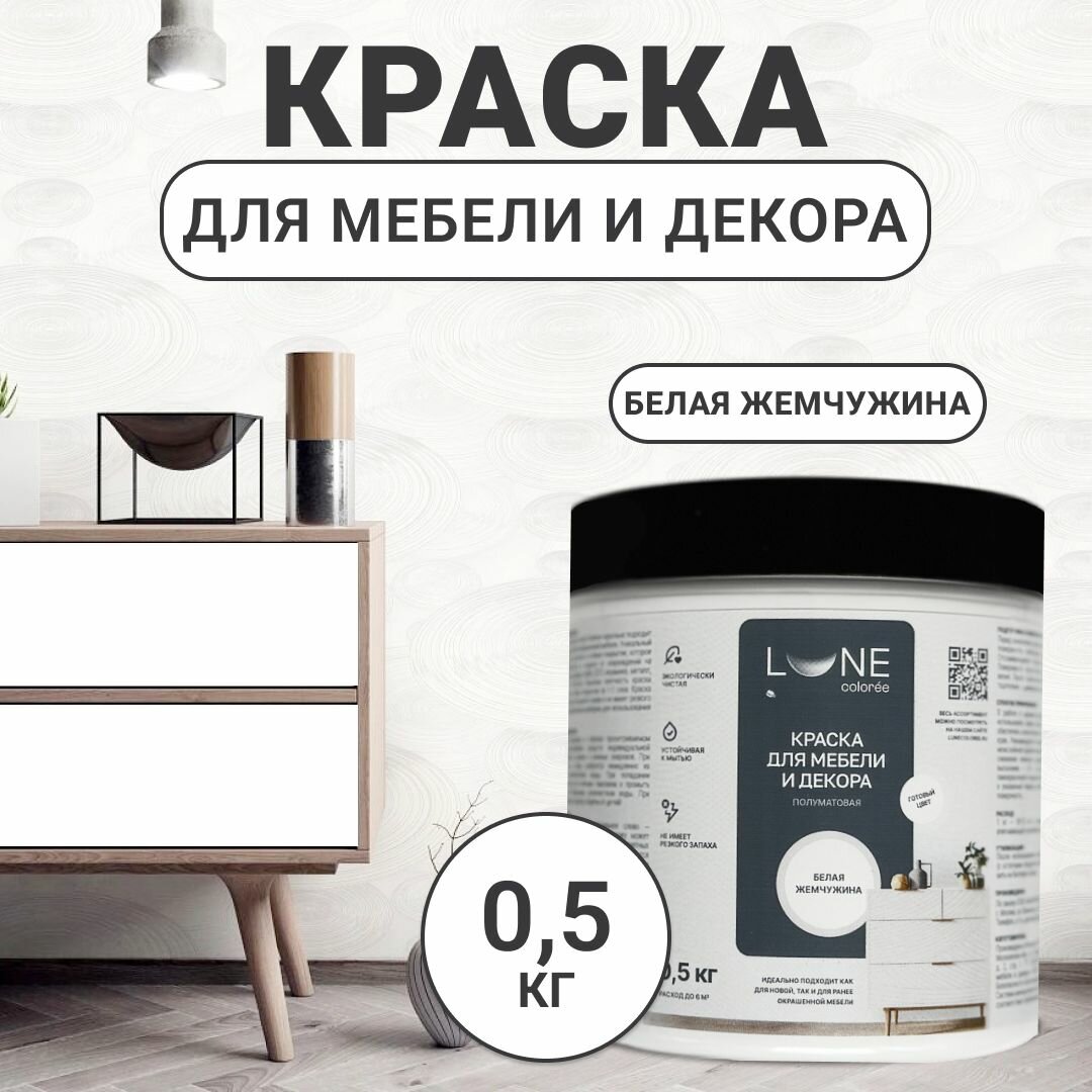 Краска для мебели, дерева и декора акриловая быстросохнущая без запаха LUNE COLOREE, цвет Белая жемчужина (белая), 0,5 кг информация: