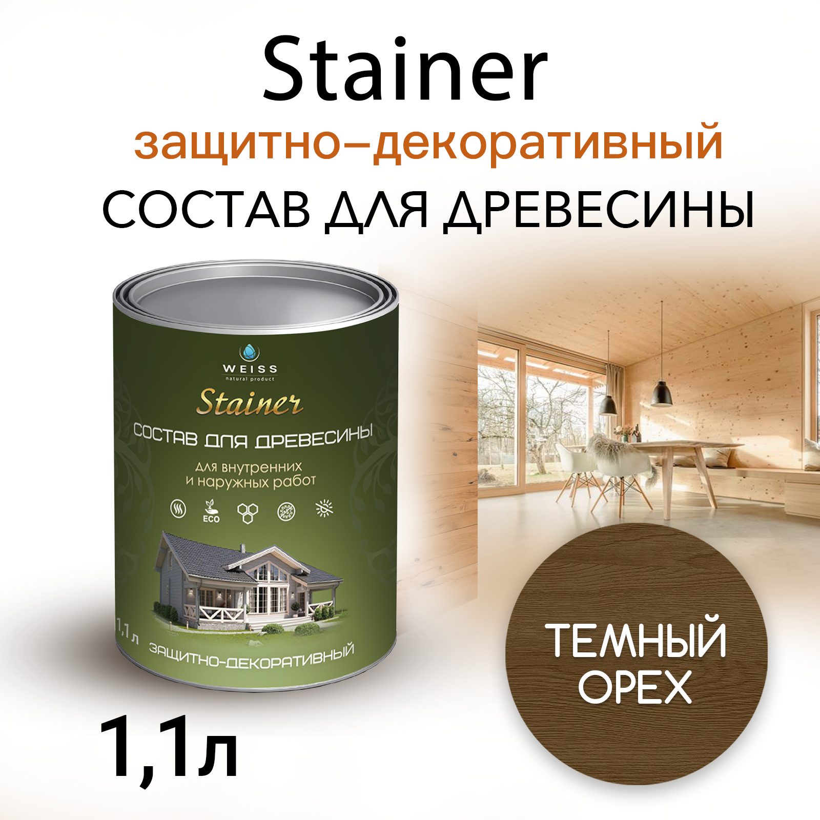Stainer 1,1л Темный орех 030, Защитно-декоративный состав для дерева и древесины, Стайнер, пропитка, защитная лазурь информация: