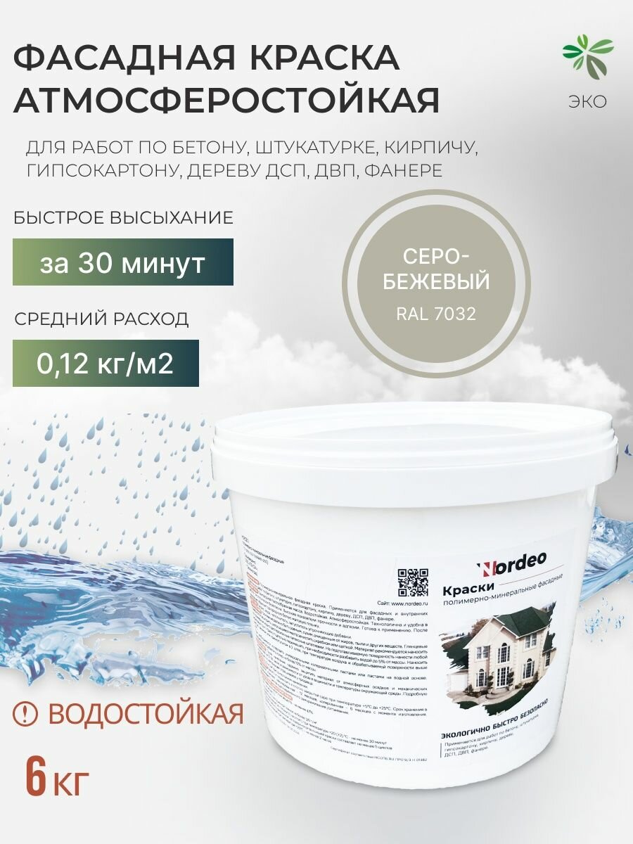 Краска фасадная по бетону Nordeo, 3 кг - цвет серо-бежевый, водостойкая, матовая 1 850 ₽