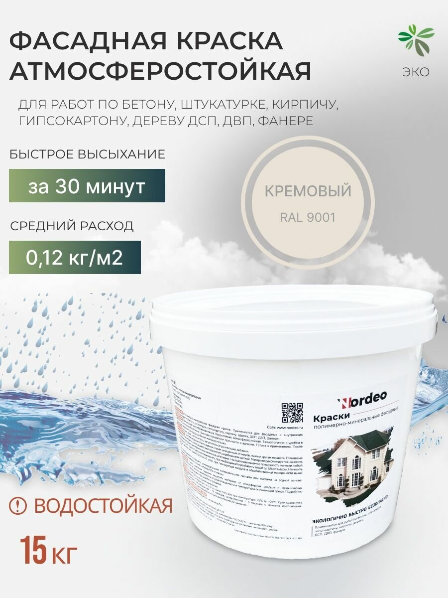 Бежевая краска фасадная для стен, дерева Nordeo водостойкая, без запаха, цвет - Молочно-бежевый, 15 кг 8 925 ₽