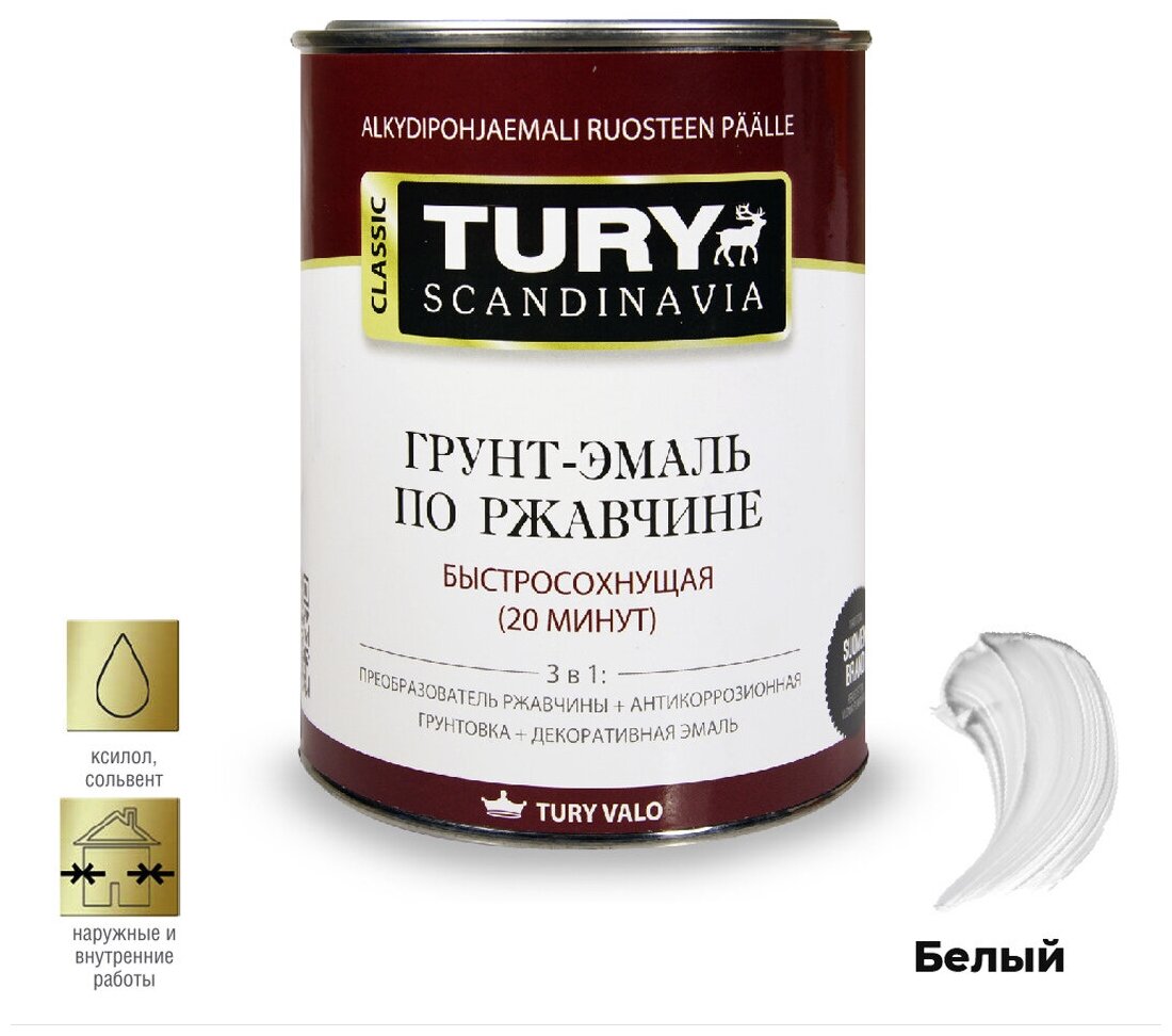 Грунт-эмаль 3 в 1 TURY МС-102 по металлу и ржавчине моментальной сушки матовая белая(RAL 9003), 2 кг информация: