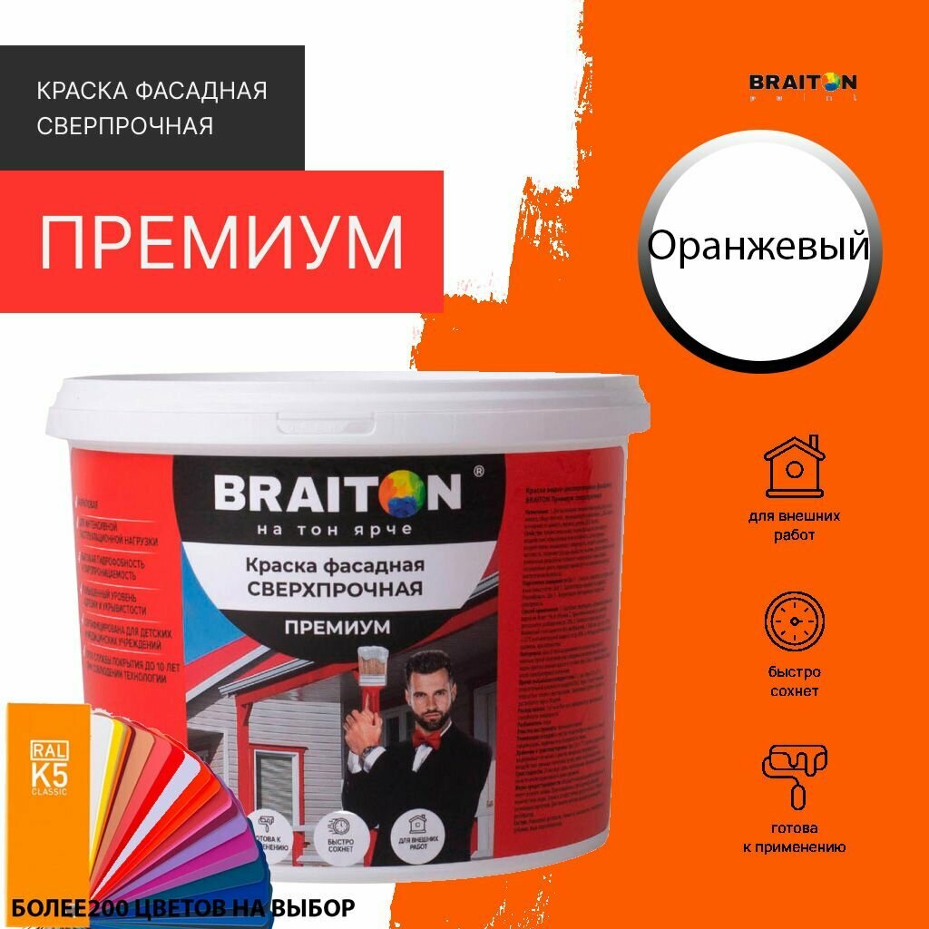 Краска ВД фасадная BRAITON Премиум Сверхпрочная 4 кг. Цвет Оранжевый RAL 2004 информация: