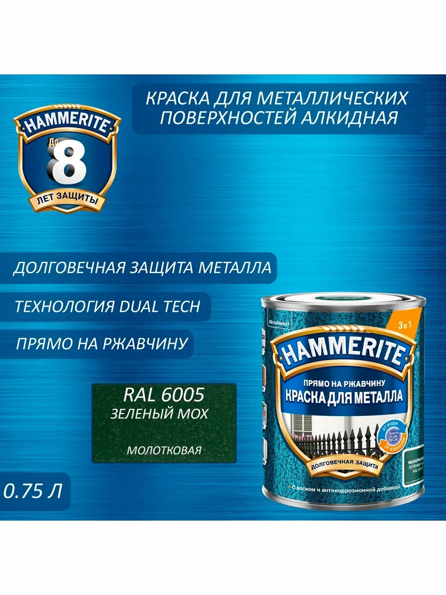 Краска для металла Hammerite молот. RAL6005 зел. мох 0,75 л информация: