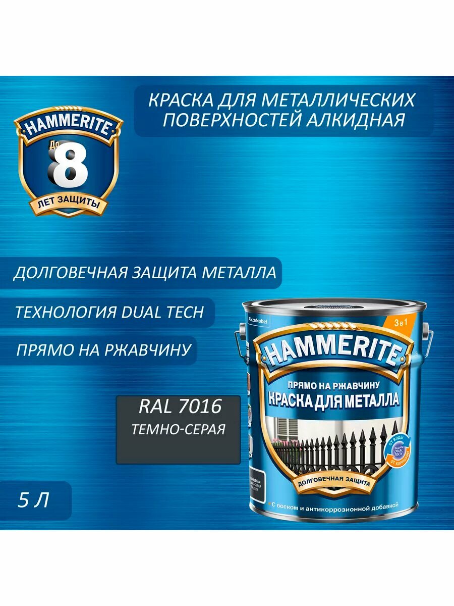 Краска для металла Hammerite гладкая RAL 7016 темн-сер. 5 л информация: