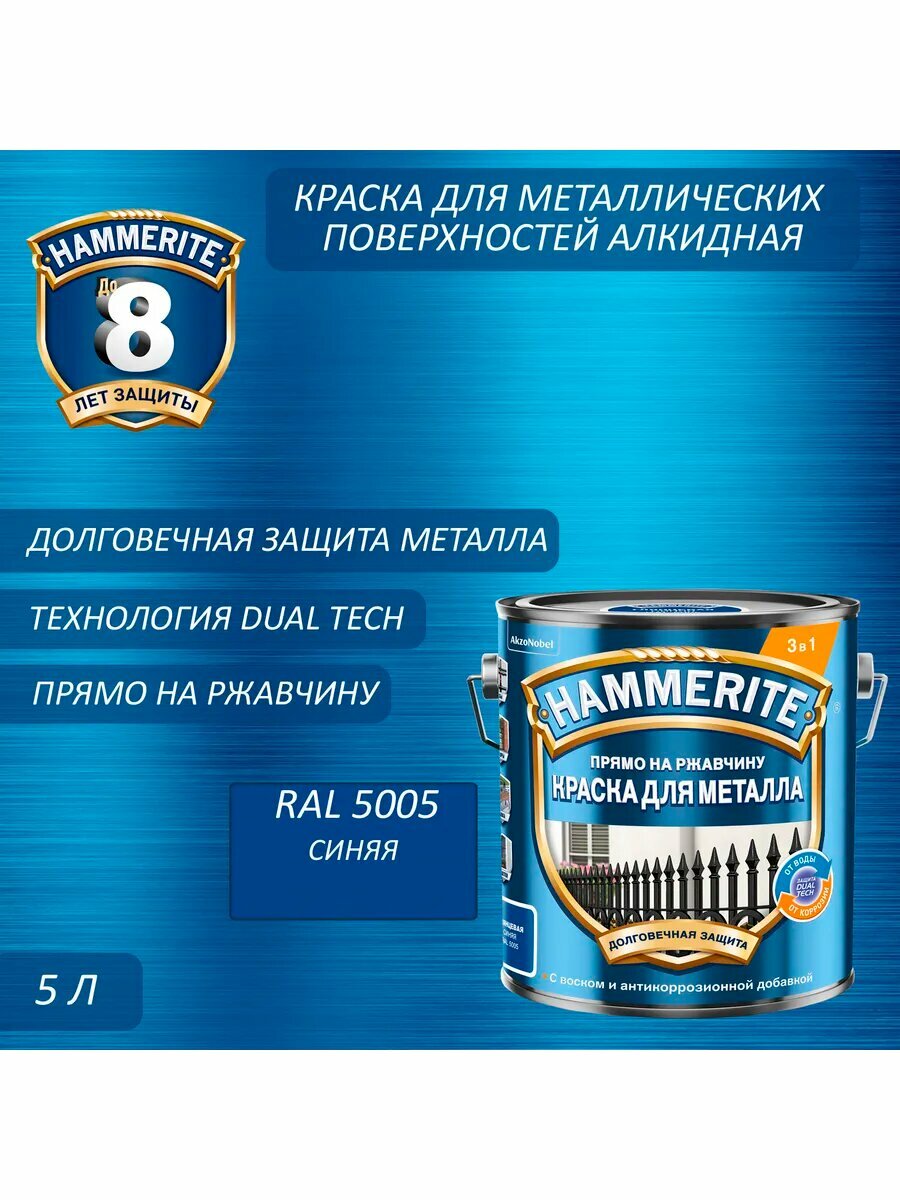 Краска для металла Hammerite гладкая RAL 5005 синяя 5 л информация: