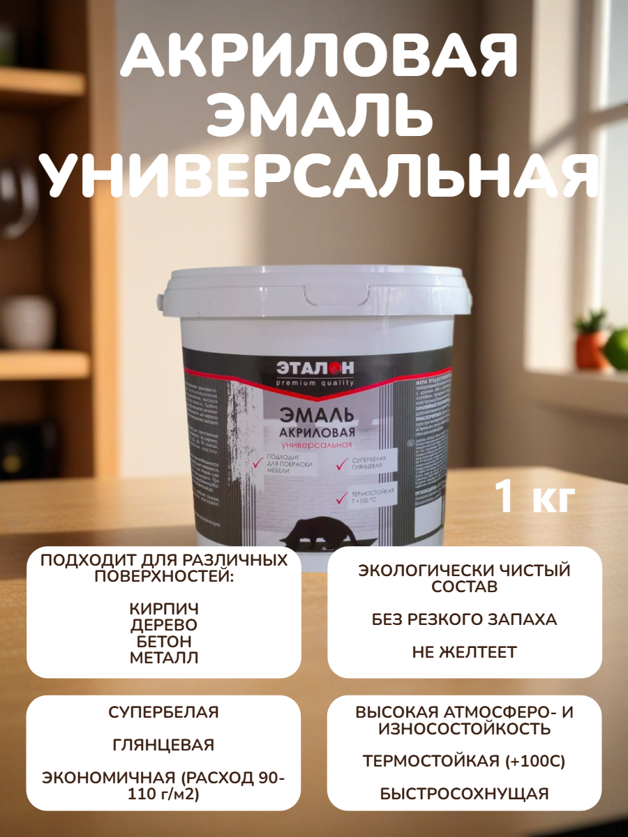 Эмаль акриловая универсальная Эталон, без запаха, белая, глянцевая 1 кг информация: