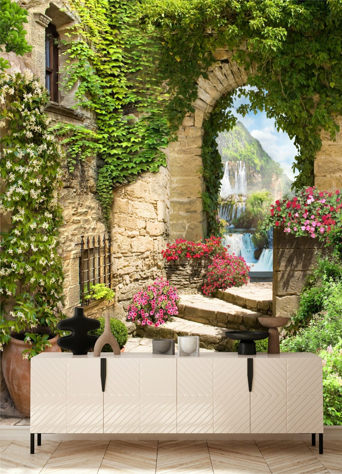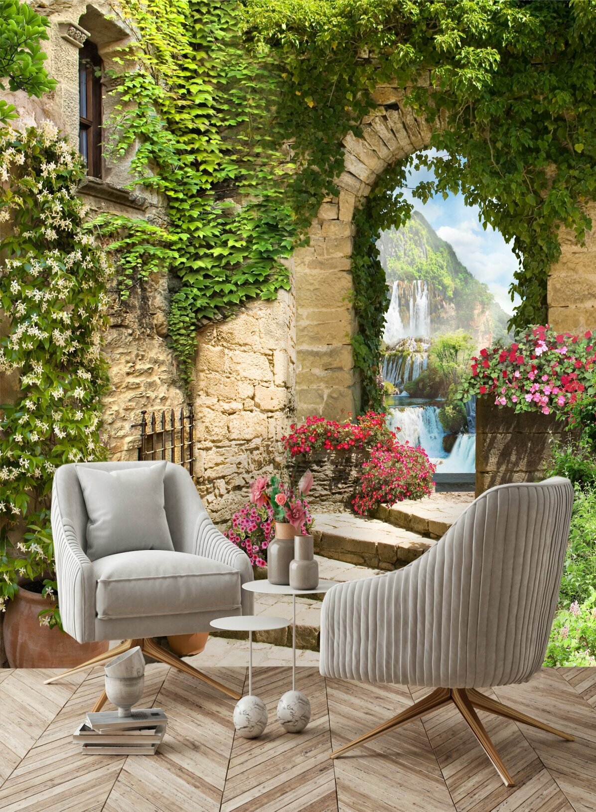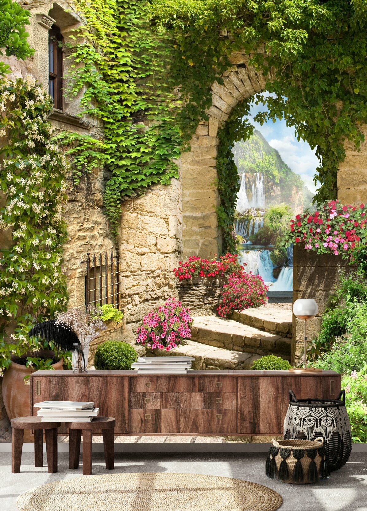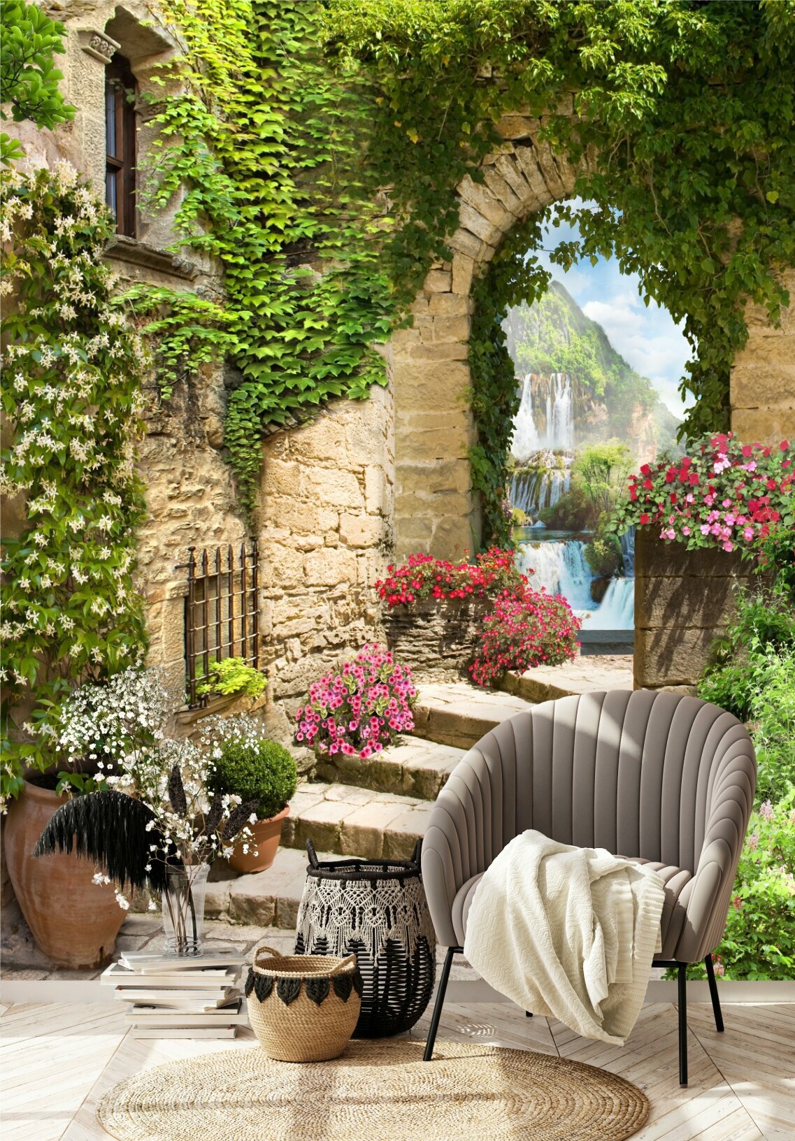 10 цен на Фотообои "Европейский дворик с аркой и водопадом" 200*260 см. /Фотообои на стену