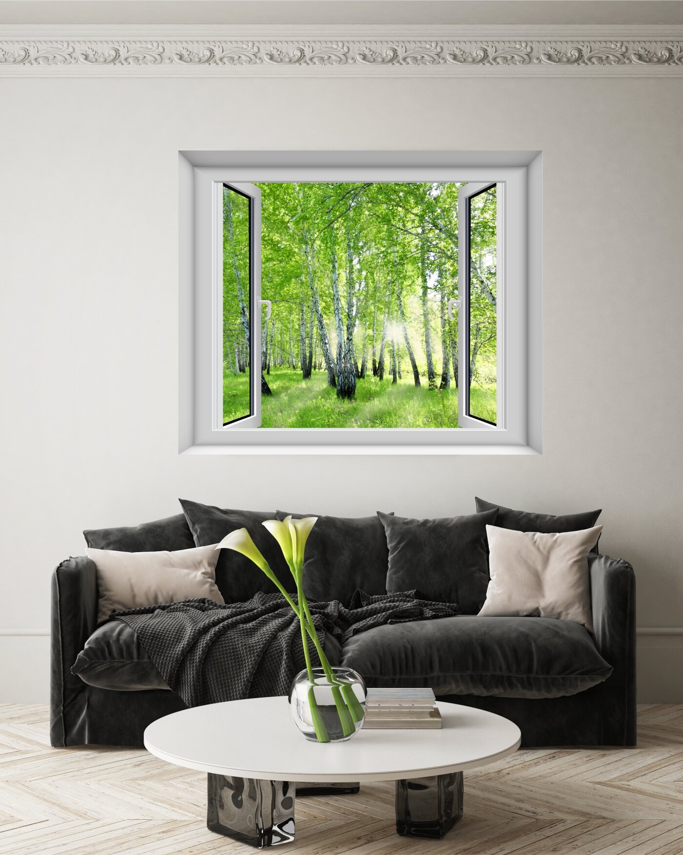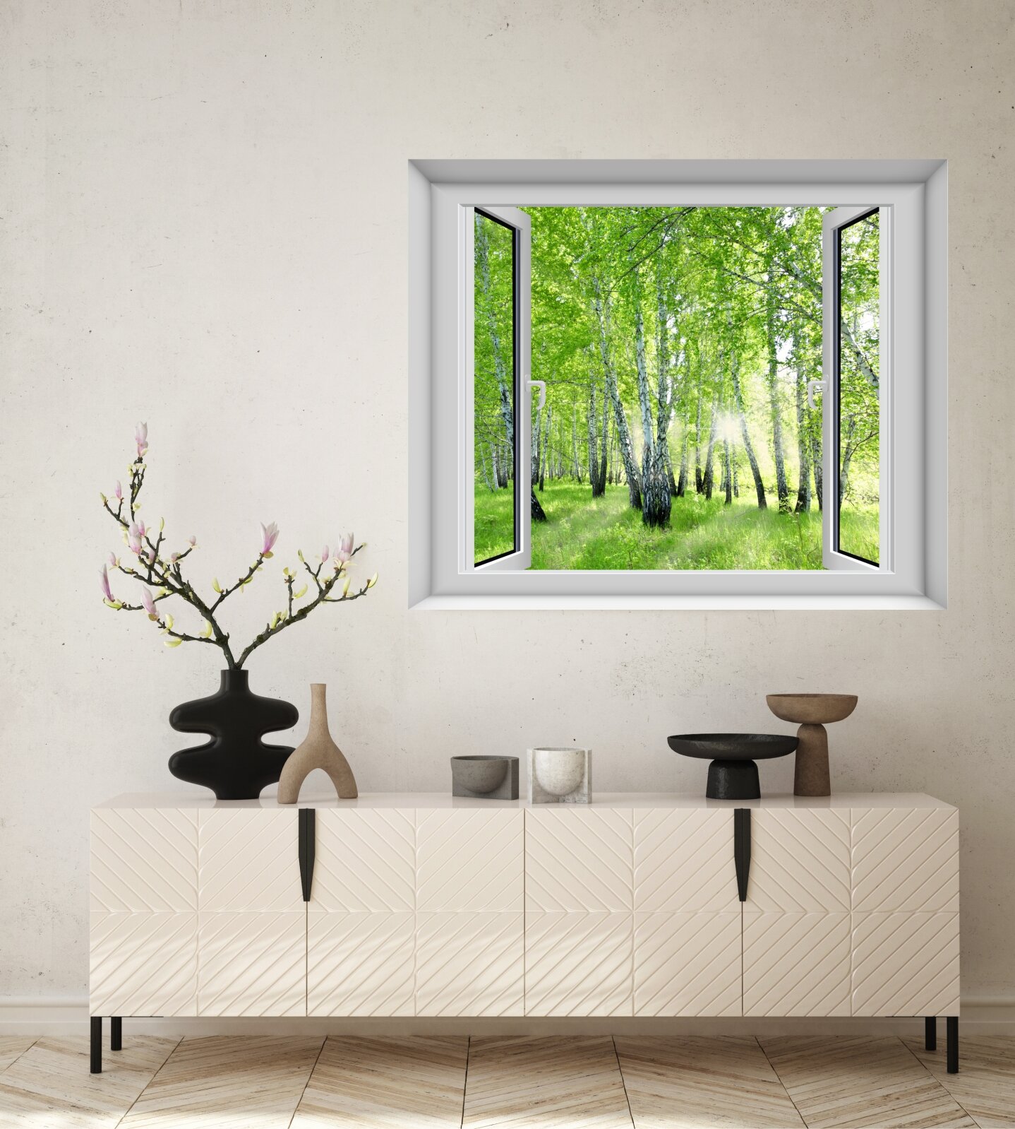 Бесшовные фотообои "Вид из окна на березовую рощу" 100х120 см информация: