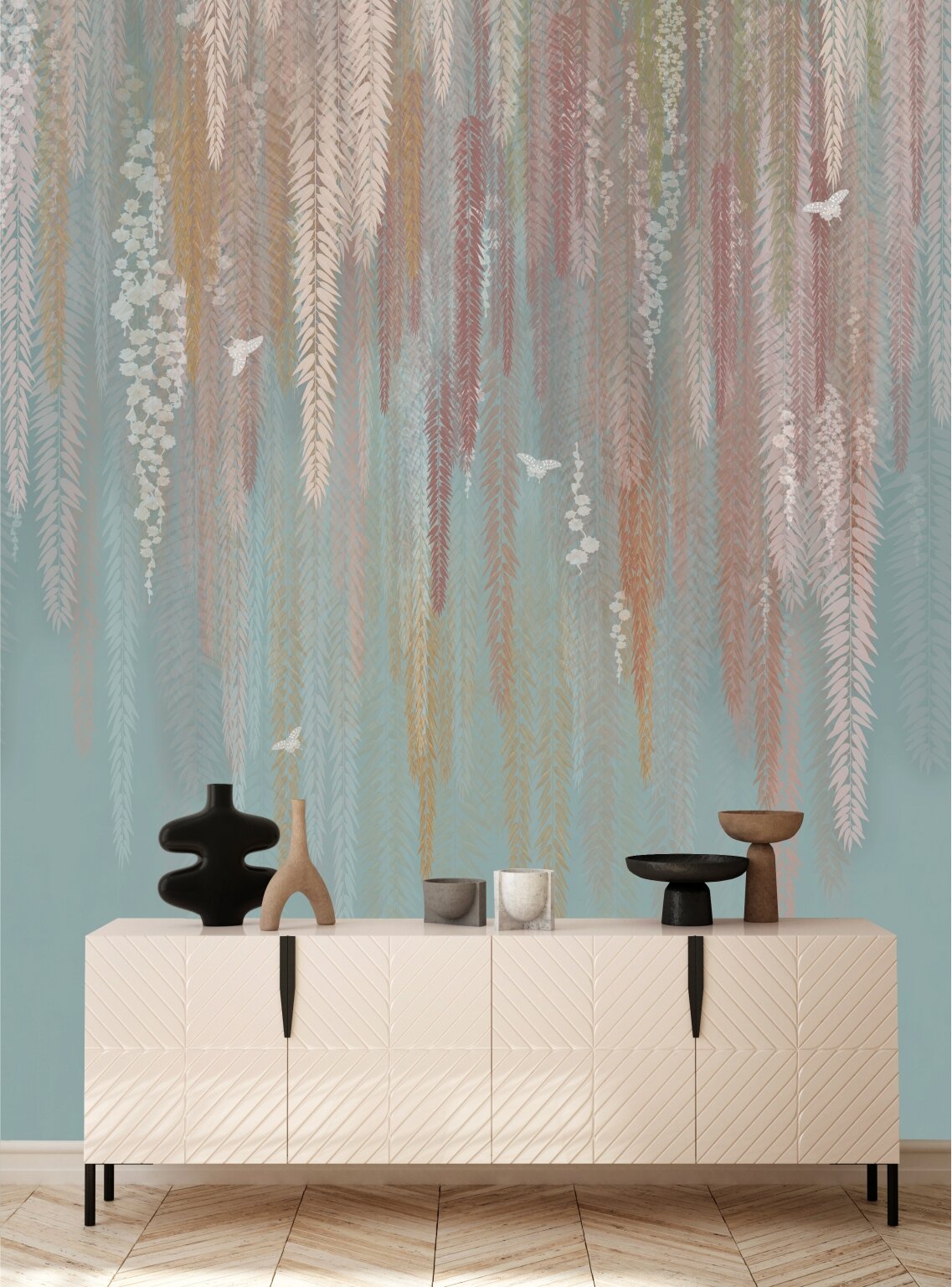 10 цен на Фотообои "Разноцветные ветви, листья с птицами и бабочками" 200*260 см. /Флизелиновые фотообои на стену