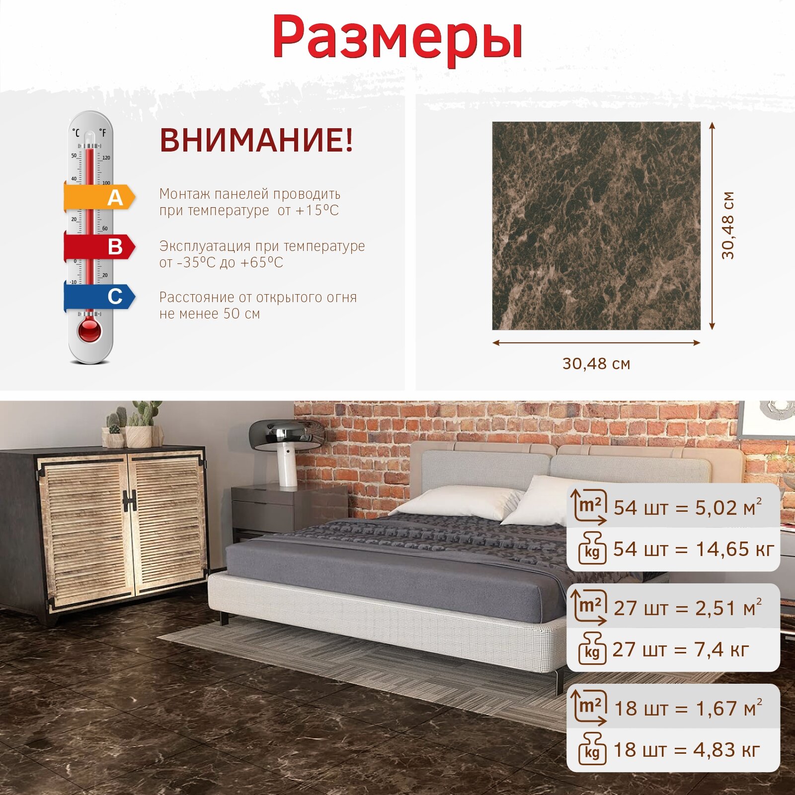 Самоклеящаяся плитка для пола влагостойкая кварц виниловая клеевая "Марбл Винтаж коричневый" 30.48 х 30.48 см 18 шт. информация: