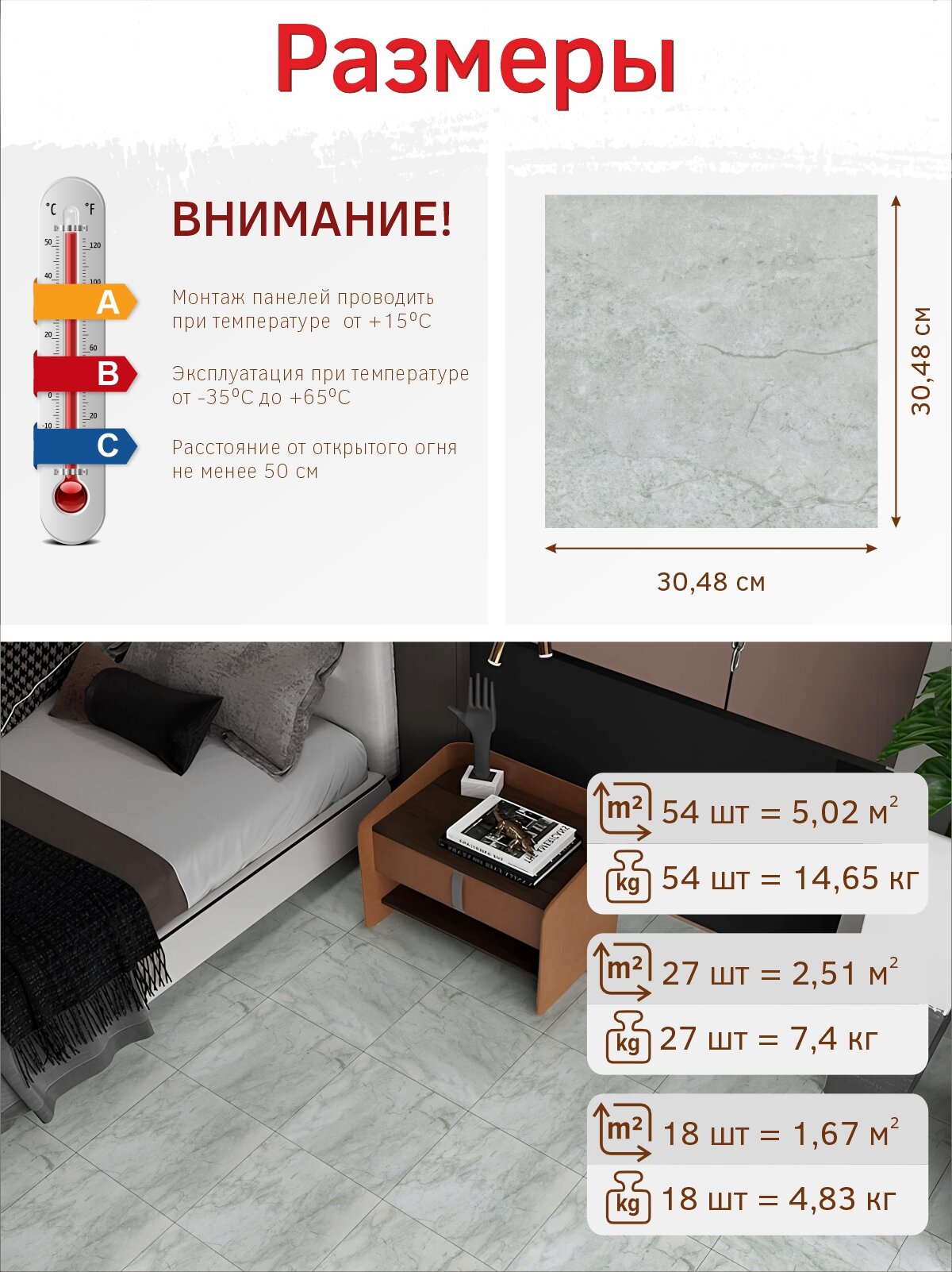 Самоклеящаяся плитка для пола влагостойкая кварц виниловая клеевая "Мрамор Саяны" 30.48 х 30.48 см 27 шт. информация: