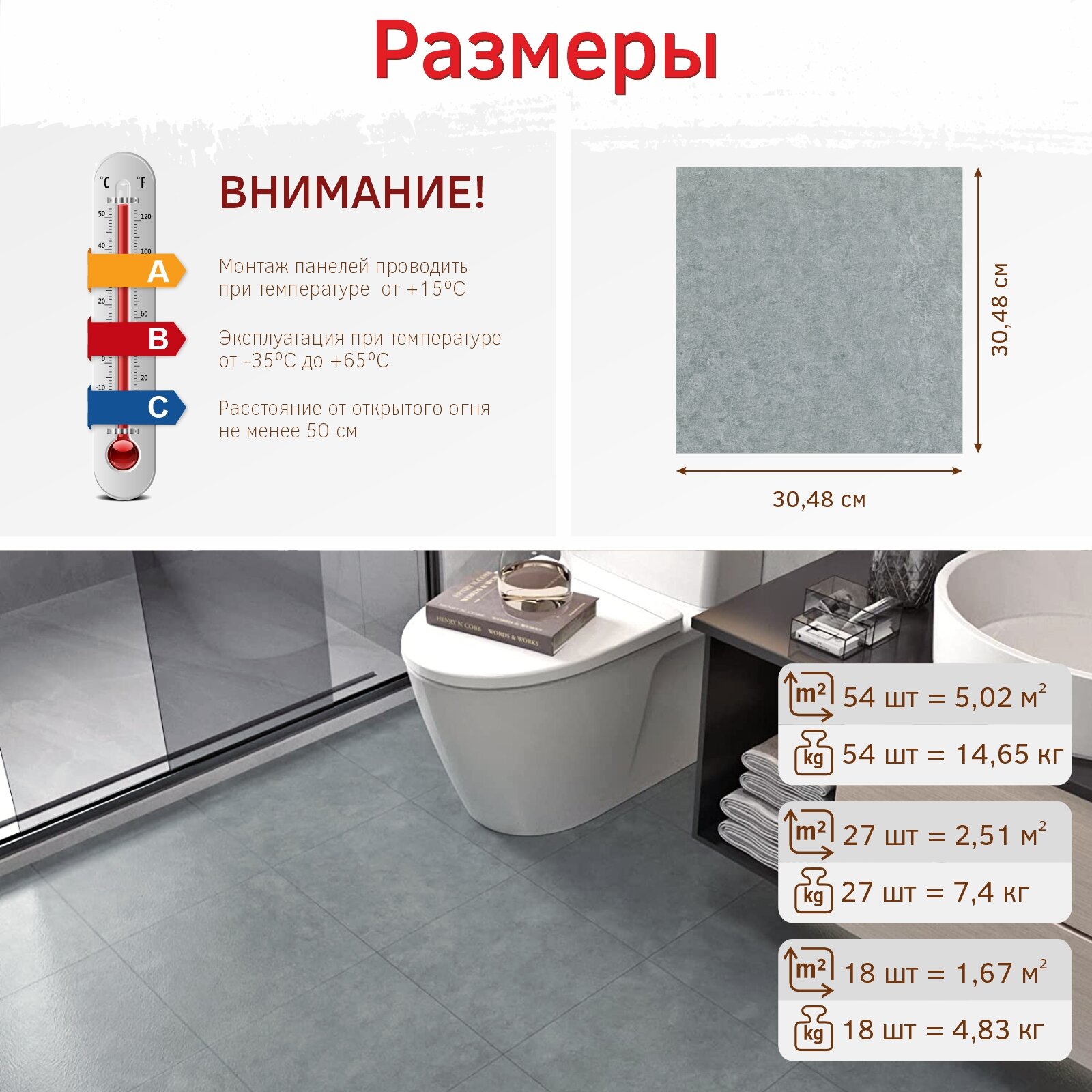 Cамоклеящаяся влагостойкая кварц виниловая плитка для пола клеевая "Грей стоун" 30.48 х 30.48 см 27 шт. вместо линолеума и ламината из МДФ информация:
