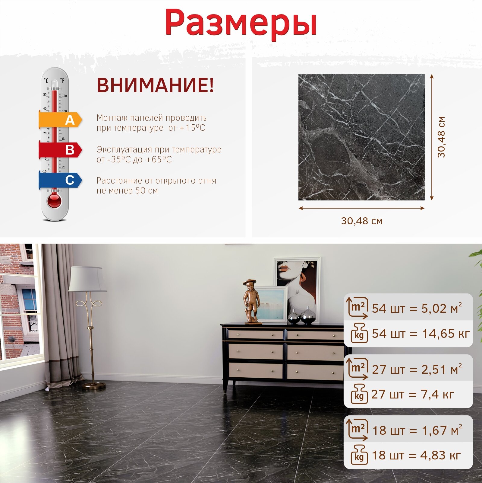 Самоклеящаяся плитка для пола влагостойкая кварц виниловая клеевая Bazzart "Марбл черный" кварц-винил 30.48 х 30.48 см 27 шт. информация: