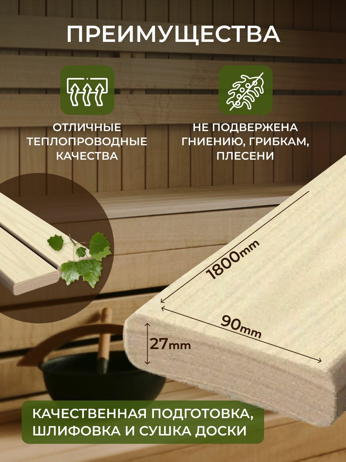 Доска на полок из Осины для бани и сауны 90х27 1800 мм 3 штуки информация: