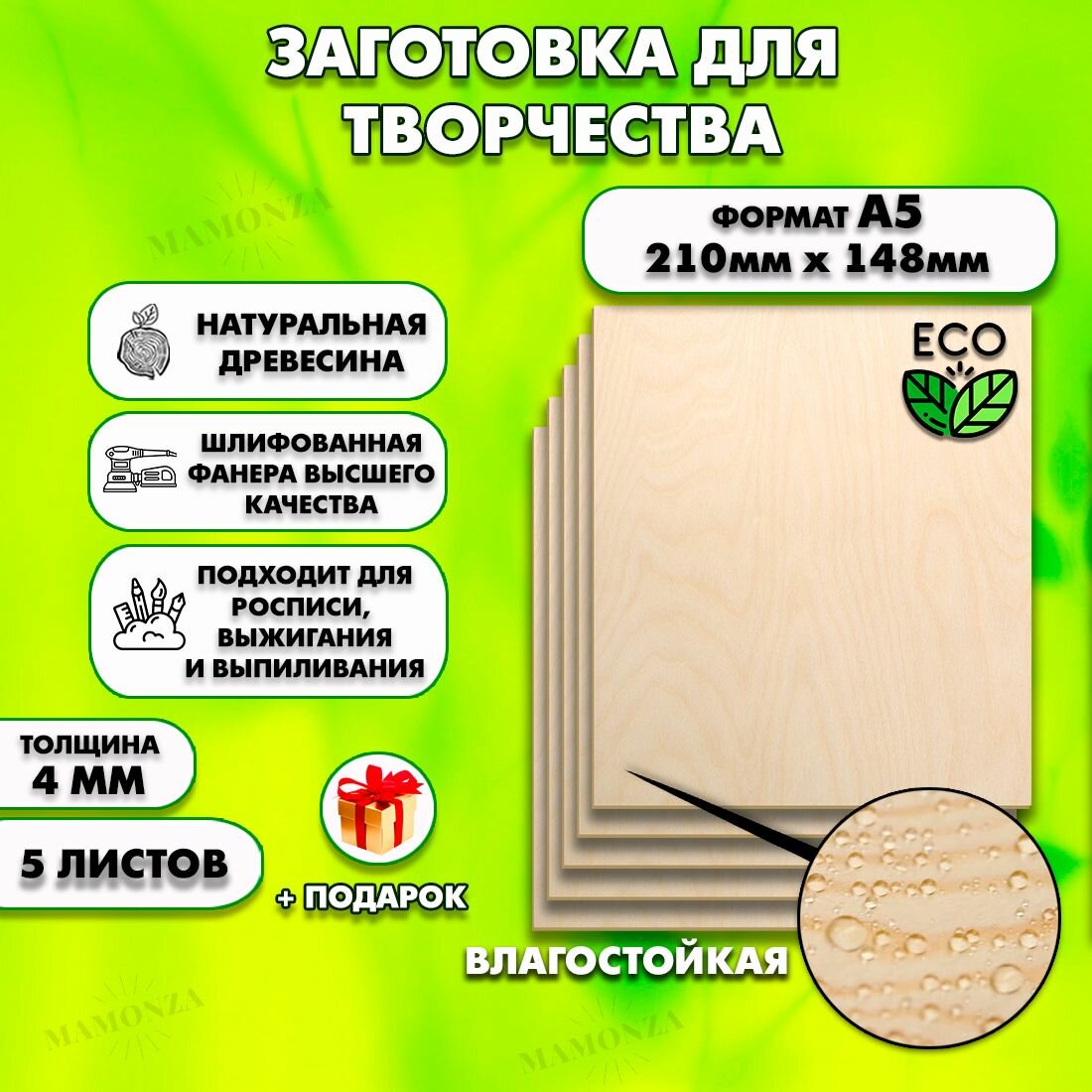 Фанера для уроков труда, рисования и творчества, Размер А5 (148х210), 5 штук, Толщина 4мм, сорт высший сорт информация: