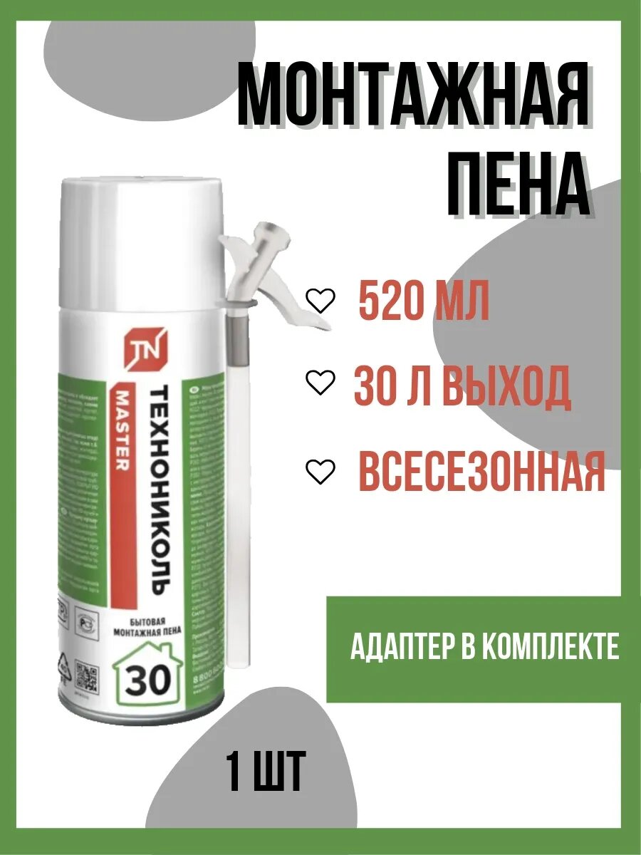 Монтажная пена ТЕХНОНИКОЛЬ МАСТЕР 30, всесезонная, 520 мл, трубка-адаптер, 30л, 1 шт информация: