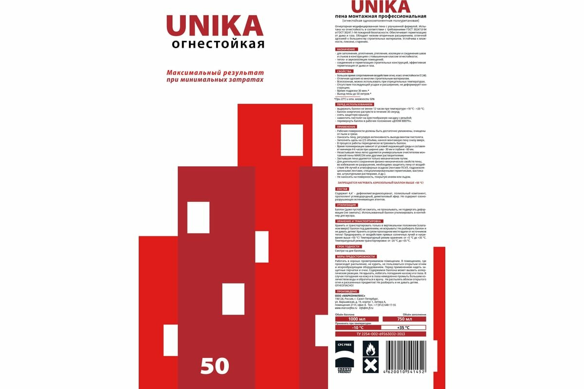 Монтажная профессиональная пена MARCON unika 50 огнестойкая 4620010541452 информация: