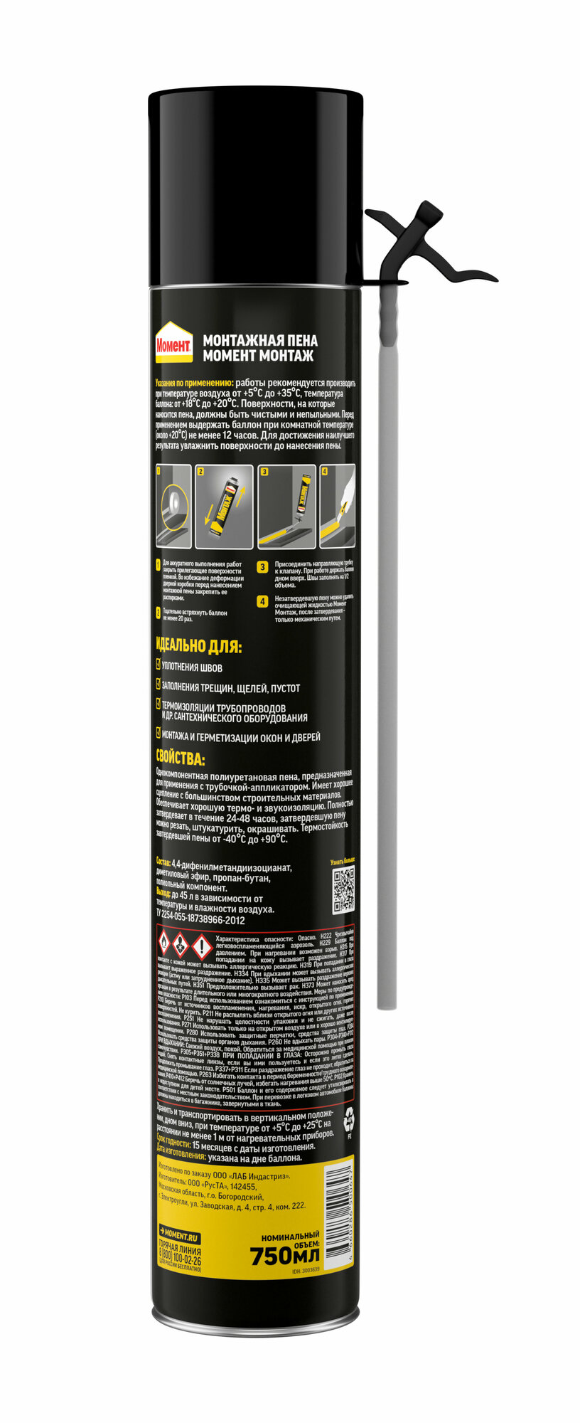 Пена монтажная Момент Монтаж, 750мл, картридж с трубкой, полиуретановая информация: