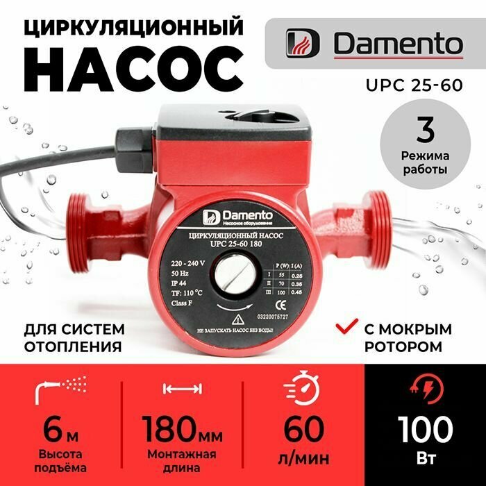 Насос циркуляционный для отопления DAMENTO UPC 25-60 (100 Вт, 60л/мин, 6 м, 180 мм) информация: