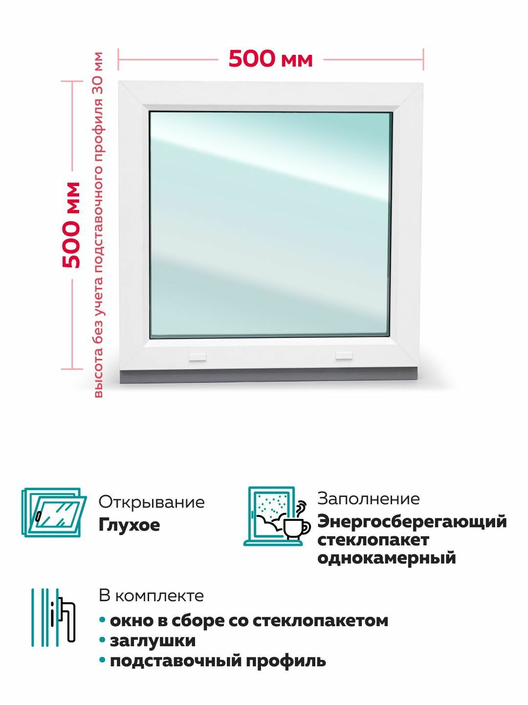 Пластиковое окно ПВХ 500х500 мм глухое, энергосберегающий стеклопакет однокамерный, одностворчатое, белое информация: