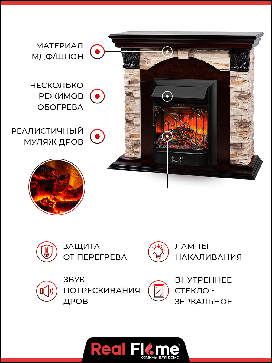 Электрокамин RealFlame Dublin Rock коричневый МДФ с очагом Majestic, звук потрескивания дров, обогрев, имитация пламени информация:
