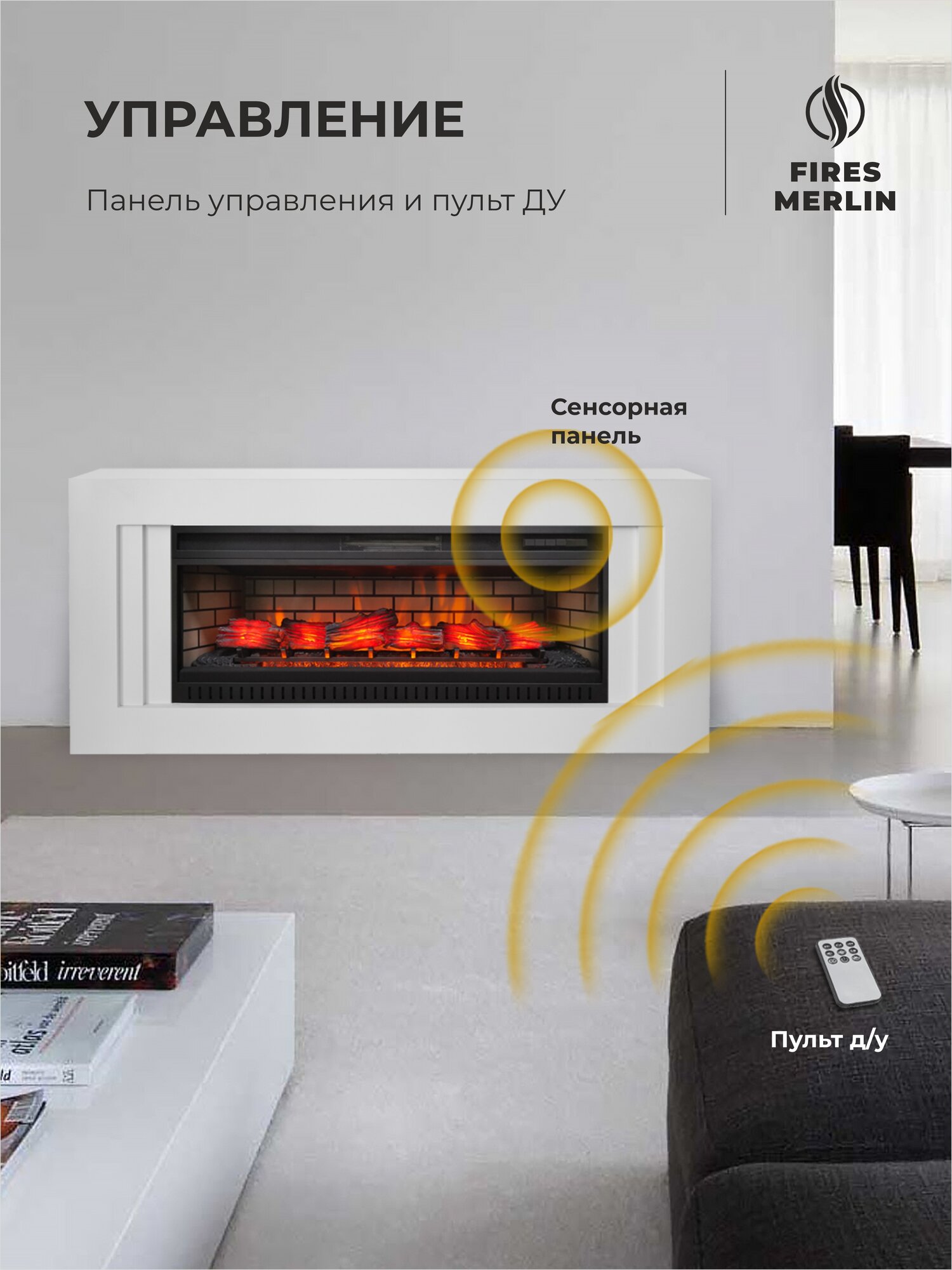 Электрокамин Fires Merlin Lord WT белый c очагом, звуковая имитация и пульт ДУ, современный стиль 40 340 ₽