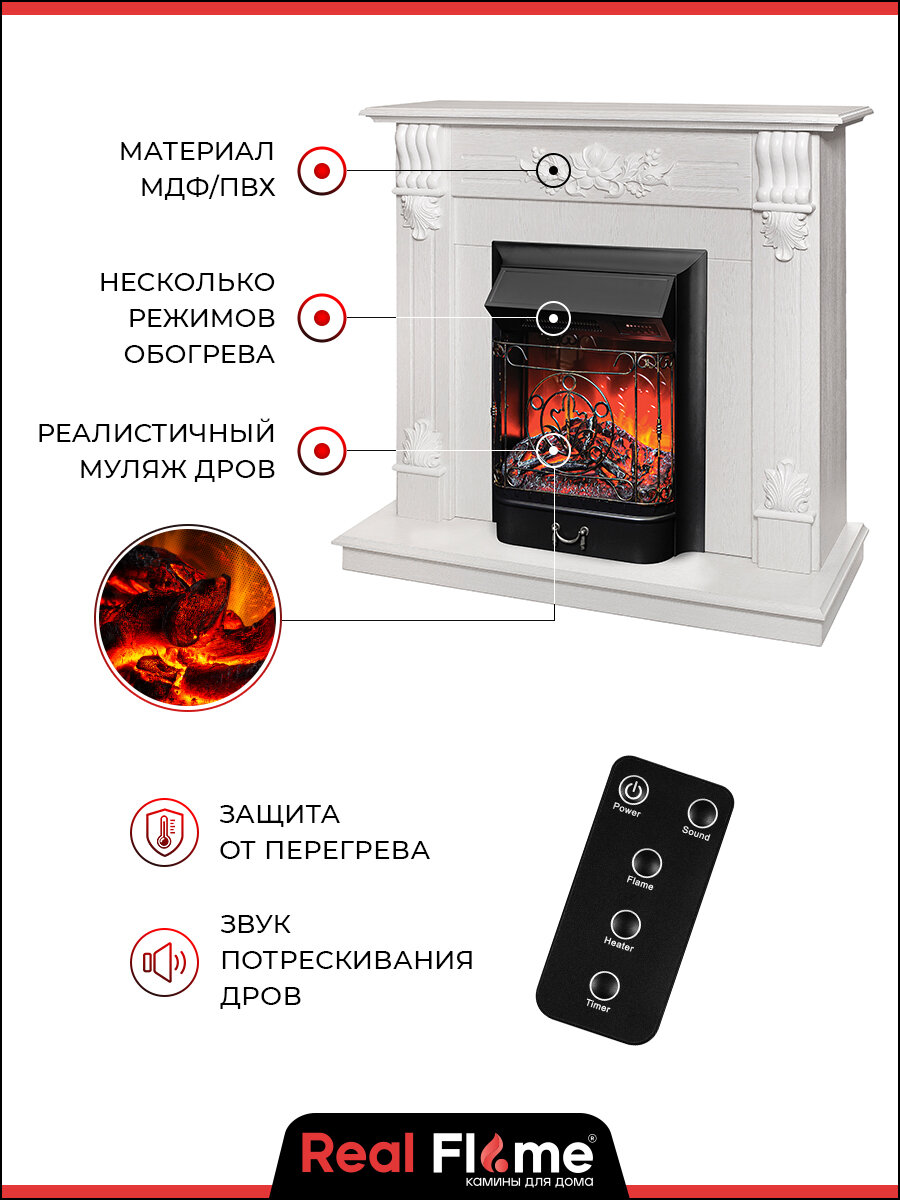 Отзывы на Электрокамин RealFlame Ottawa WT МДФ с очагом Majestic, звук потрескивания дров, обогрев, имитация пламени, пульт ДУ