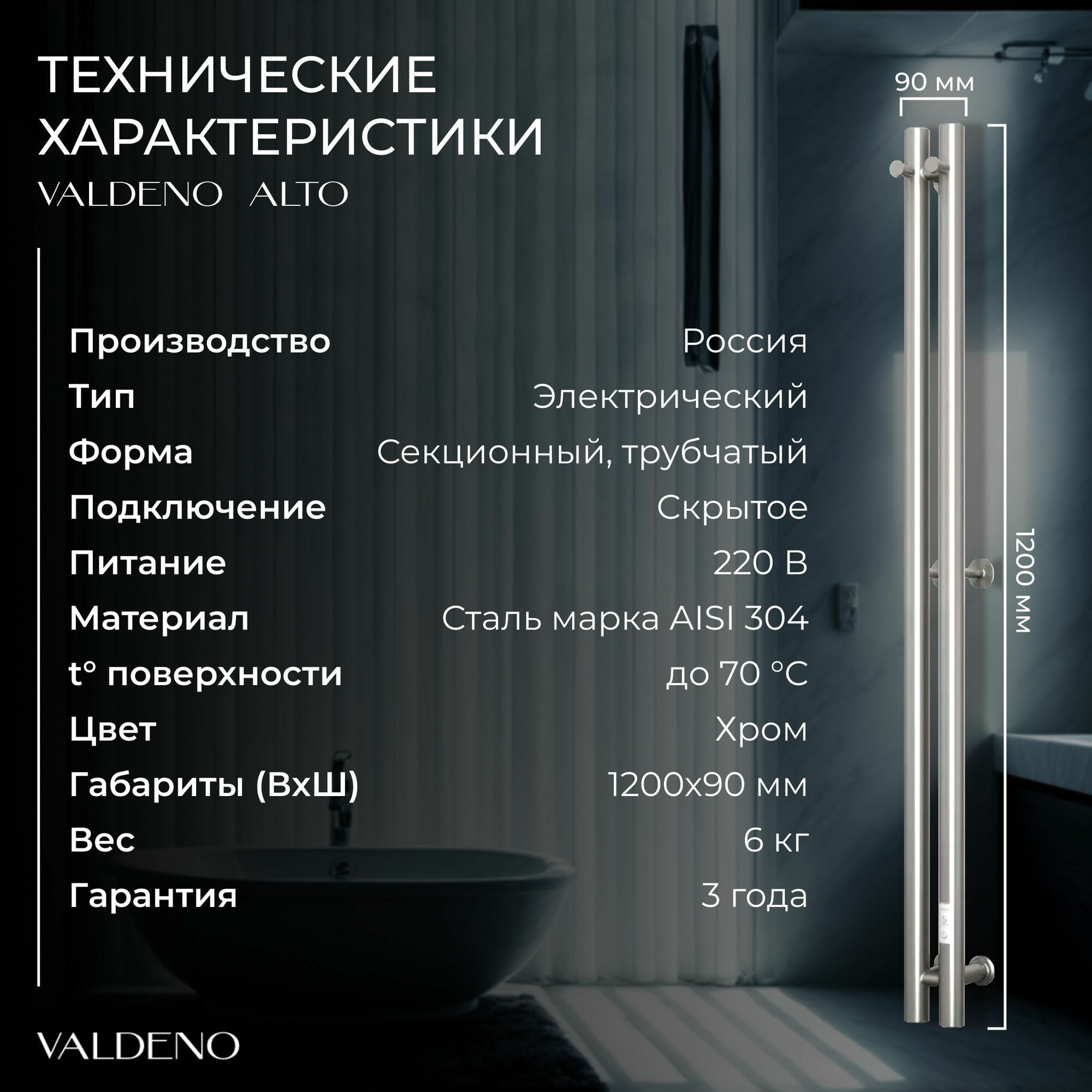 Полотенцесушитель электрический вертикальный ALTO 1200 стальной, скрытый монтаж, черный 8 320 ₽