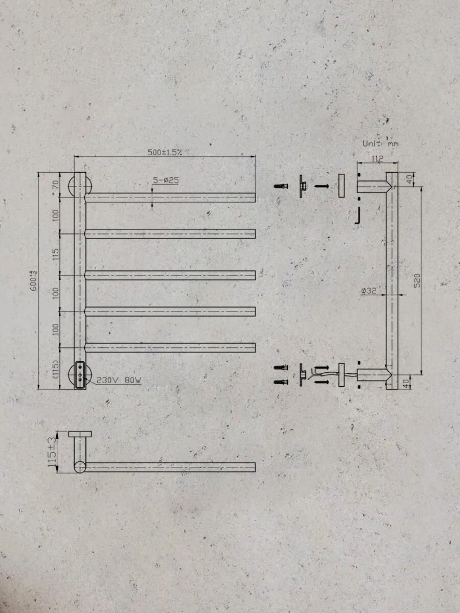 TERMINUS Полотенцесушитель электрический Terminus Хендрикс П6 500x596, ТЭН HT-1 300W, левый/правый