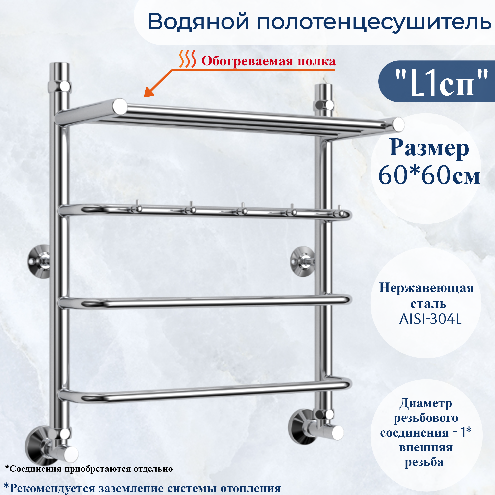Отзывы на Водяной полотенцесушитель из нержавеющей стали юрма модель L1сп размер 600x600mm нижнее подключение 1* наружная резьба с полкой и крючками