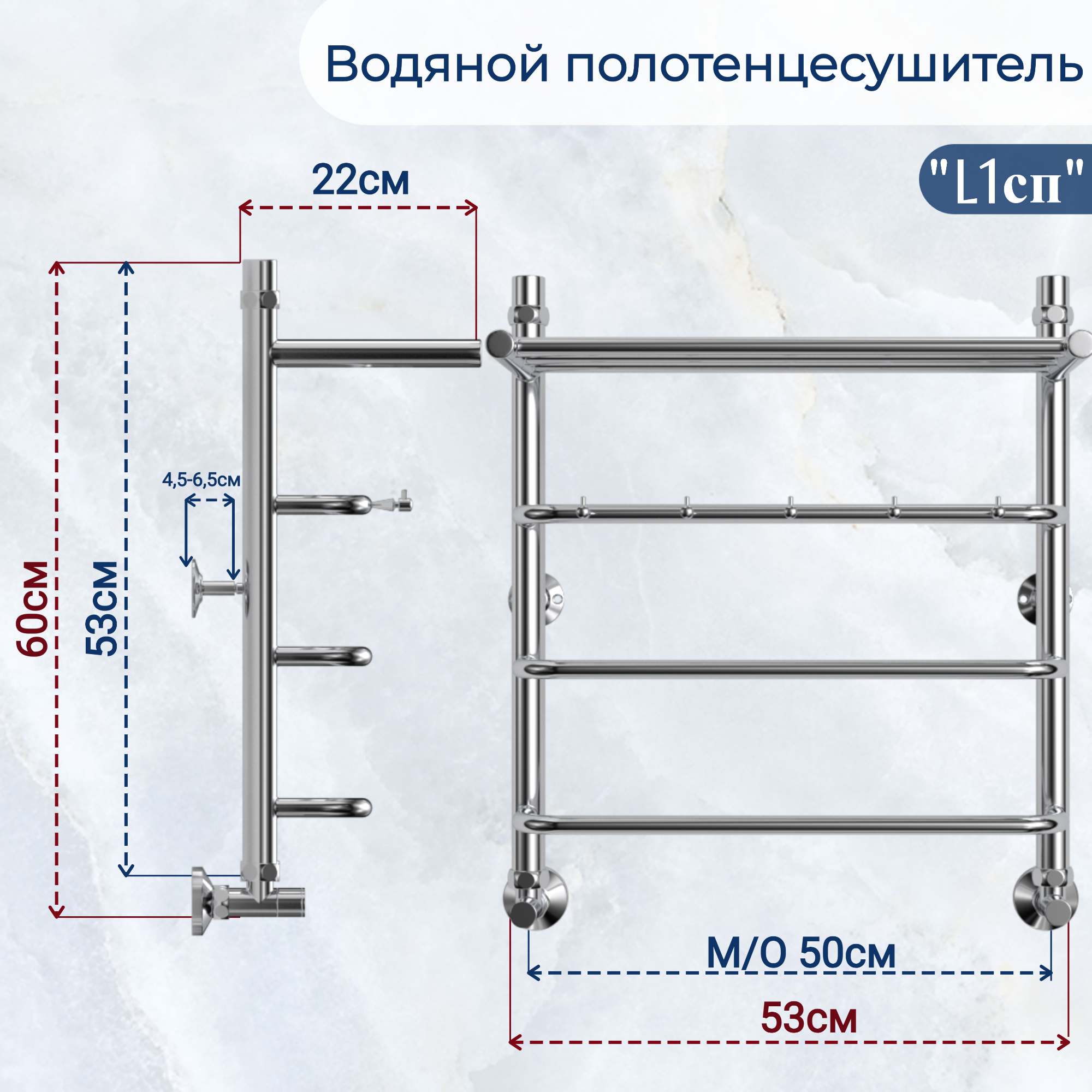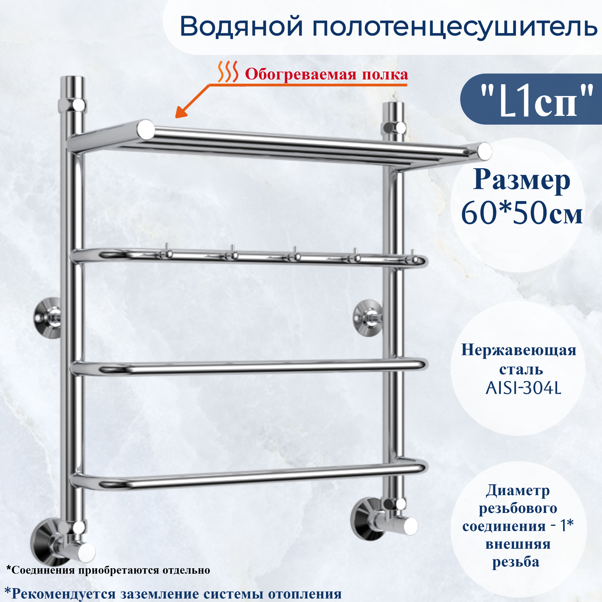 Водяной полотенцесушитель юрма модель L1сп размер 60*50сm нижнее подключение 1* наружная резьба с полкой и крючками информация: