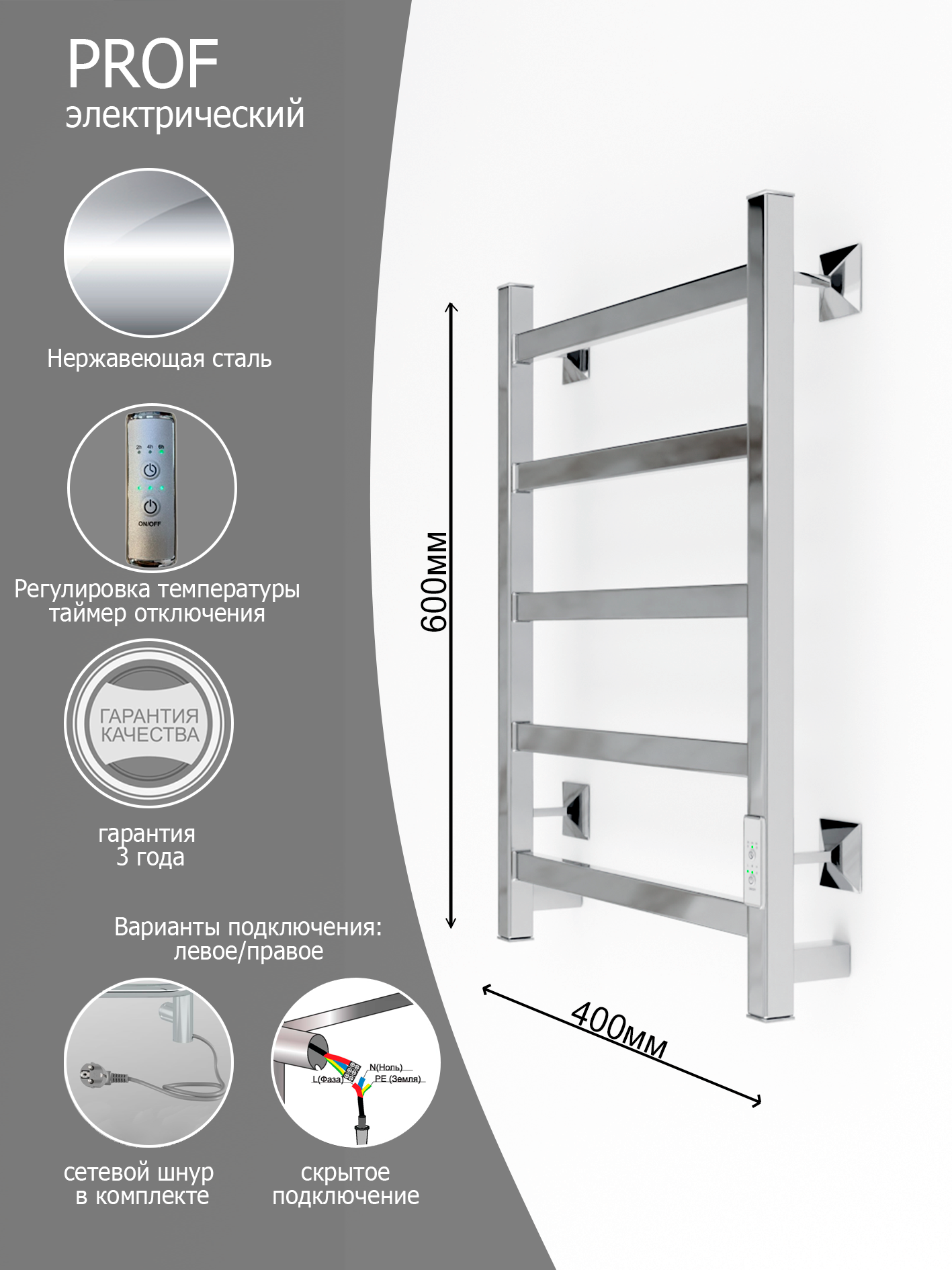 Полотенцесушитель электрический Вэлекан PROF 60x40 Хром без полки(универсальное подключение, скрытый монтаж, таймер, терморегулятор) информация: