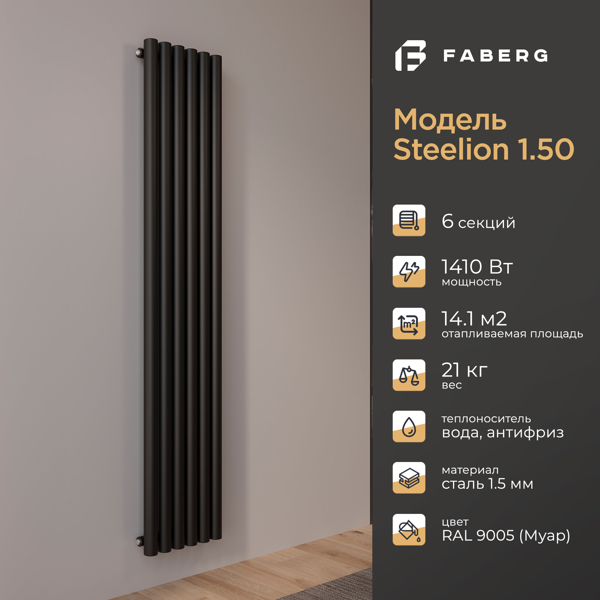 Радиатор отопления Faberg Steelion, трубчатый, 1800х360мм, 6 секций, чёрный, настенный, 1410 Вт информация: