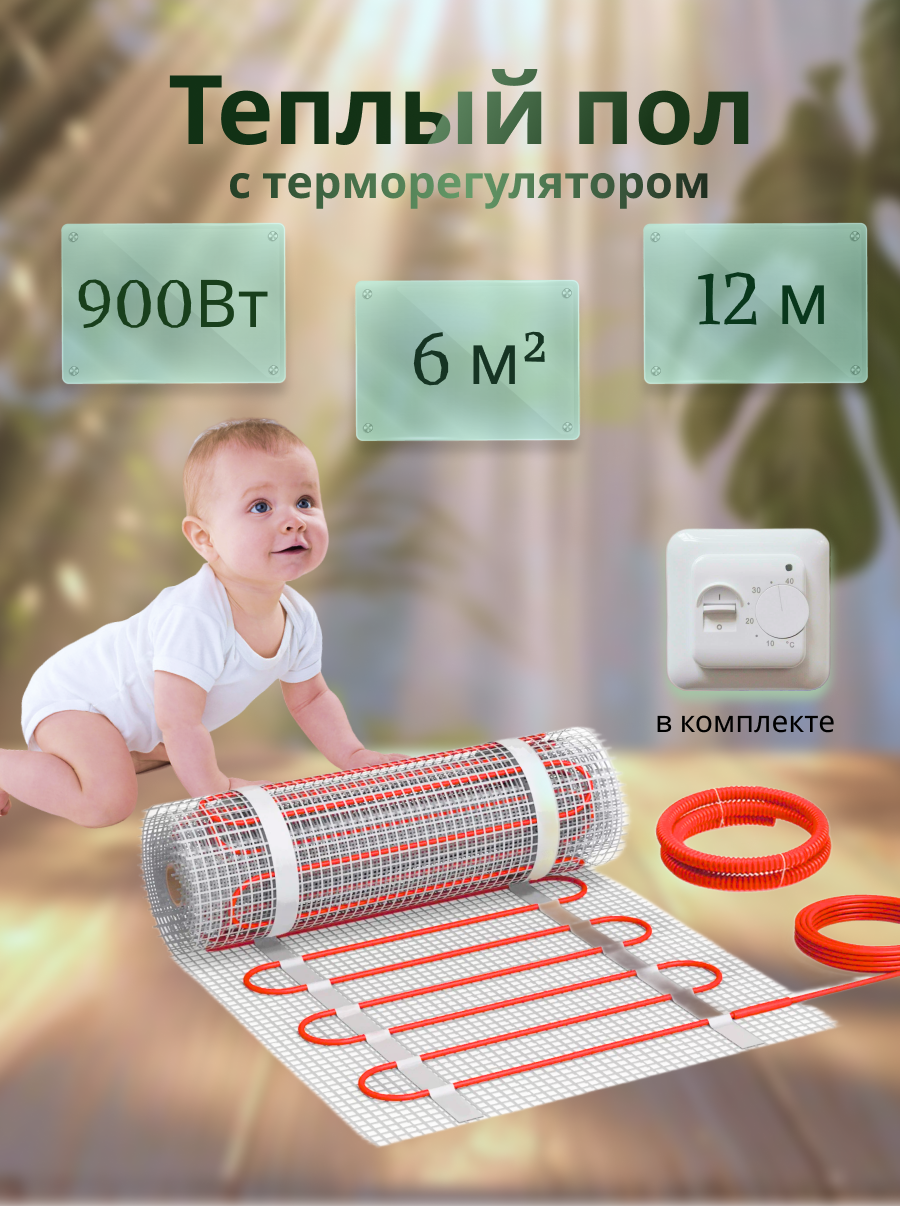 Теплый пол электрический под плитку Квадрат Тепла СТН KM Light 900Вт 6м2 с белым терморегулятором информация: