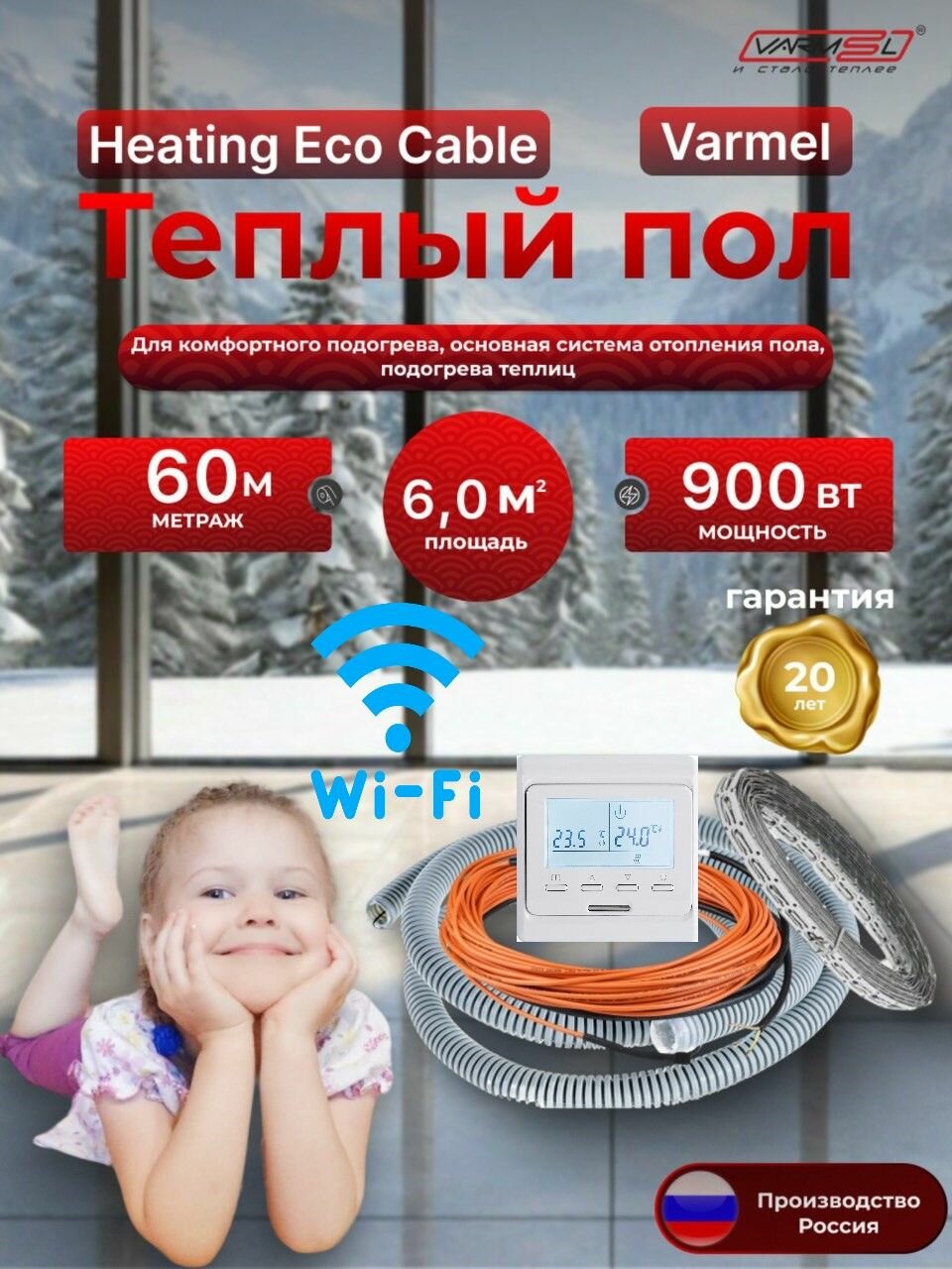 Тёплый пол электрический кабель Varmel HEC 900Вт(60м) + терморегулятор 51.716 WI-FI белый информация:
