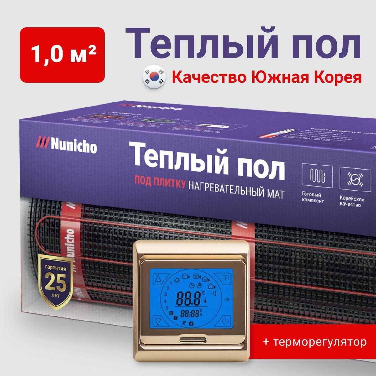 Электрический теплый пол NUNICHO 1 м2 с сенсорным золотистым терморегулятором в комплекте, 150 Вт/м2 двужильный экранированный информация: