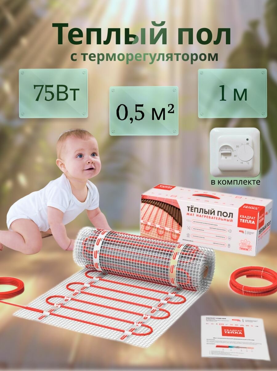 Теплый пол электрический под плитку 0,5м2 СТН Т/пол "Квадрат тепла" мат 2ж 150Вт/кв. м. СТНКМ-75-0,5 с белым терморегулятором информация: