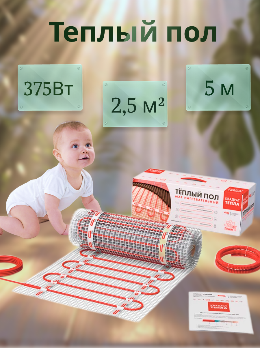Теплый пол электрический под плитку 2,5м2 СТН Т/пол "Квадрат тепла" мат 2ж 150Вт/кв. м. СТНКМ-375-2,5 информация: