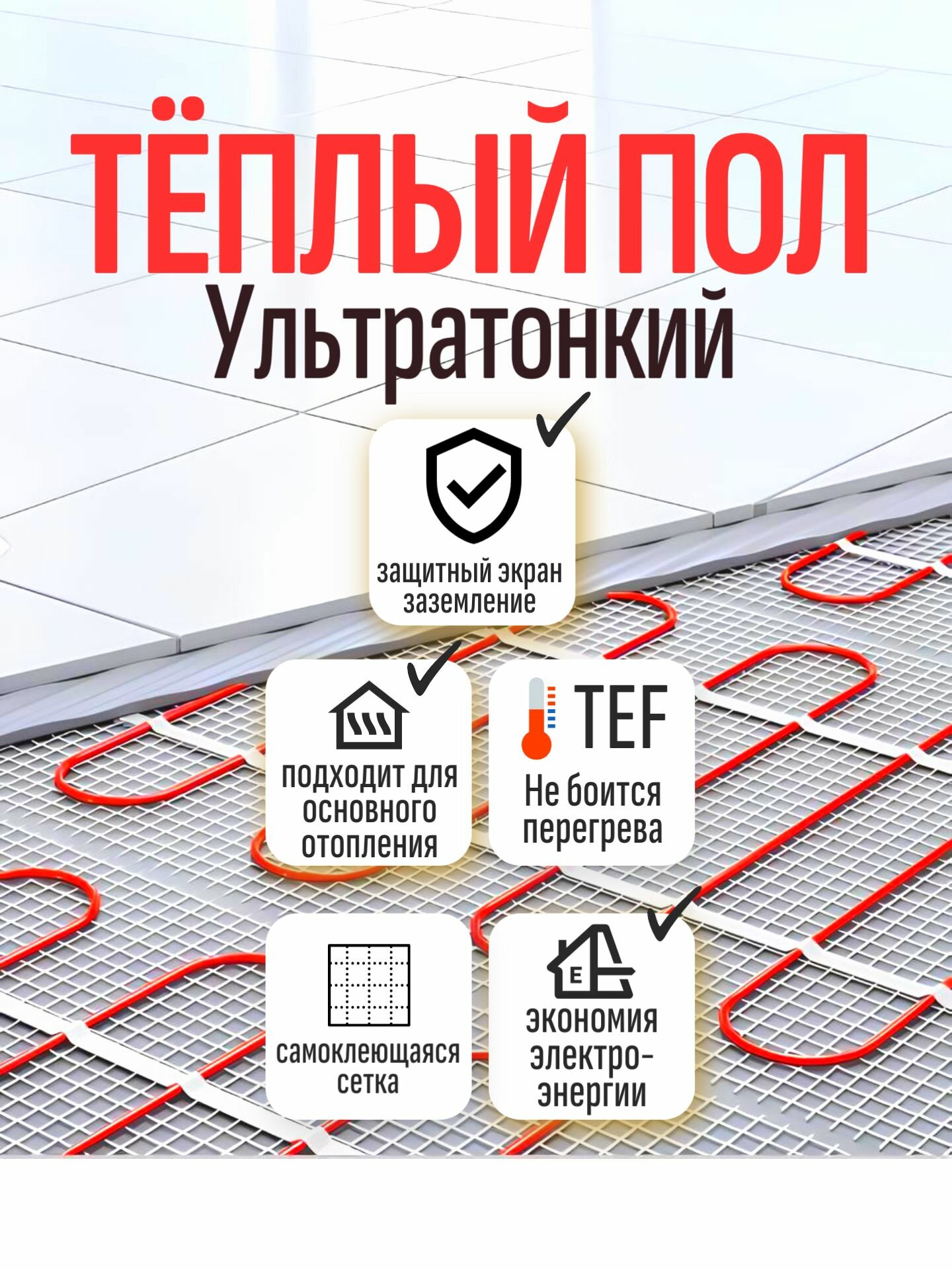 Теплый пол электрический под плитку Ридан TF-150 0,5 м2 нагревательный мат тонкий на самоклеящейся сетке