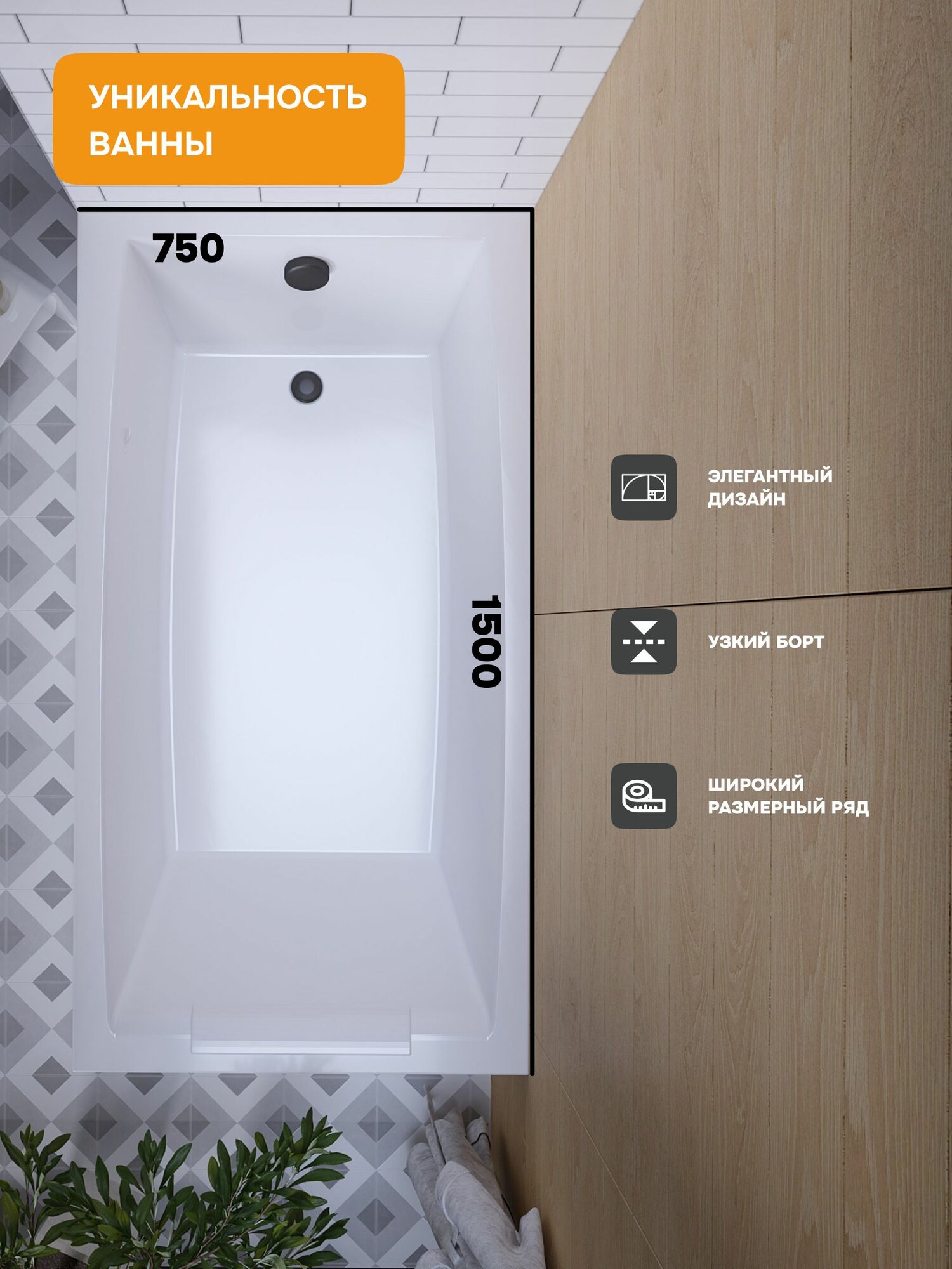 Ванна акриловая 150х75 см ABBY Прямоугольная белая, 100% сантехнический акрил, MODULEASY 01аб1575 информация: